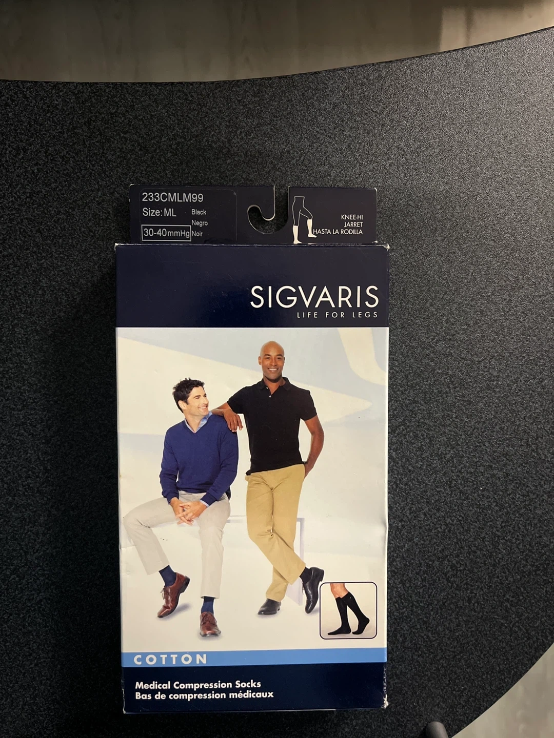 Selling a new pair of Sigvaris medical compression socks. They are black, size ML, and made of cotton. These are knee-high socks with a compression level of 30-40mmHg. Perfect for everyday wear!