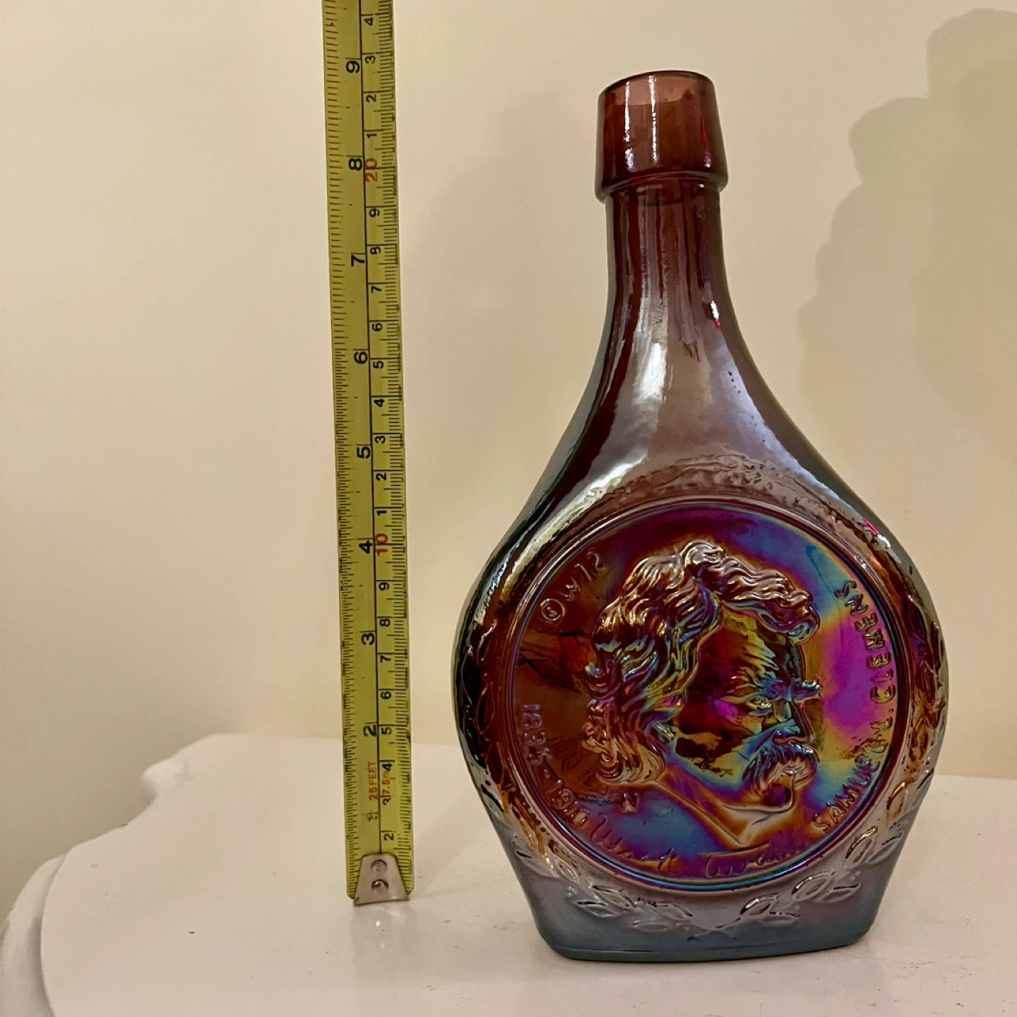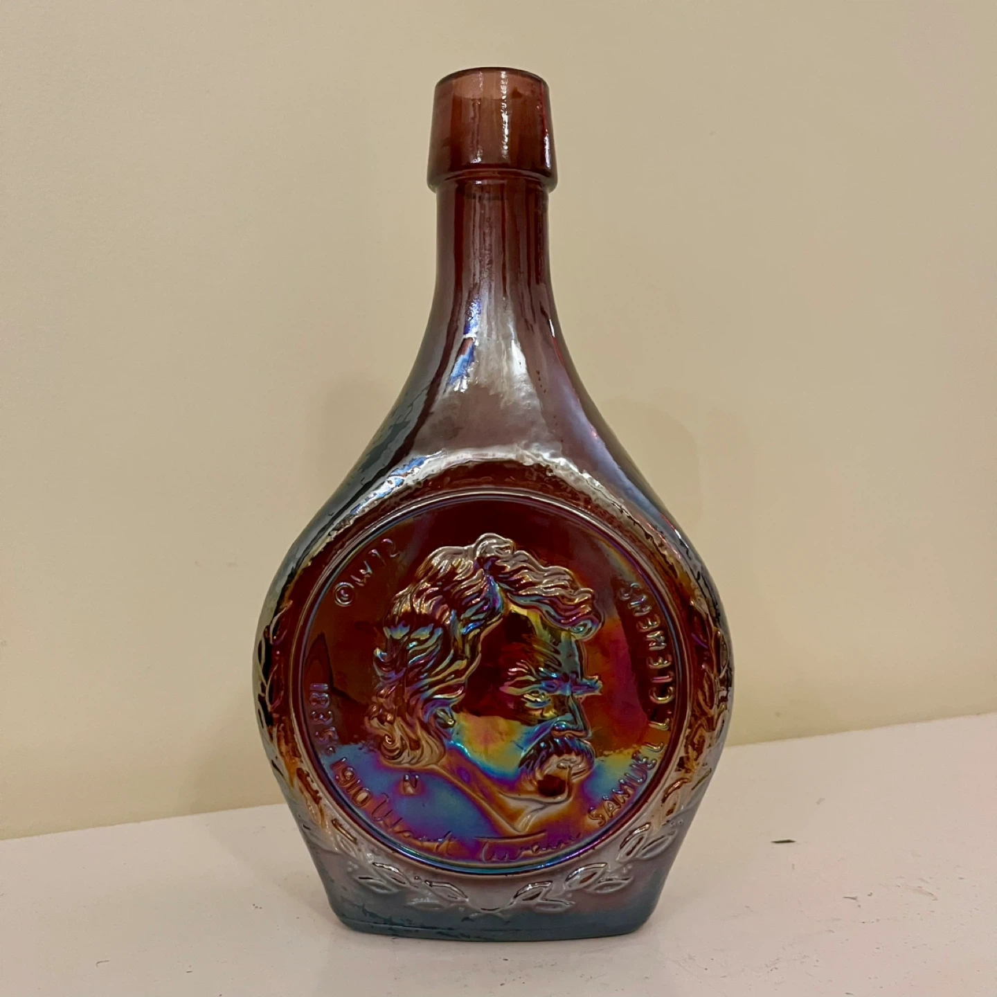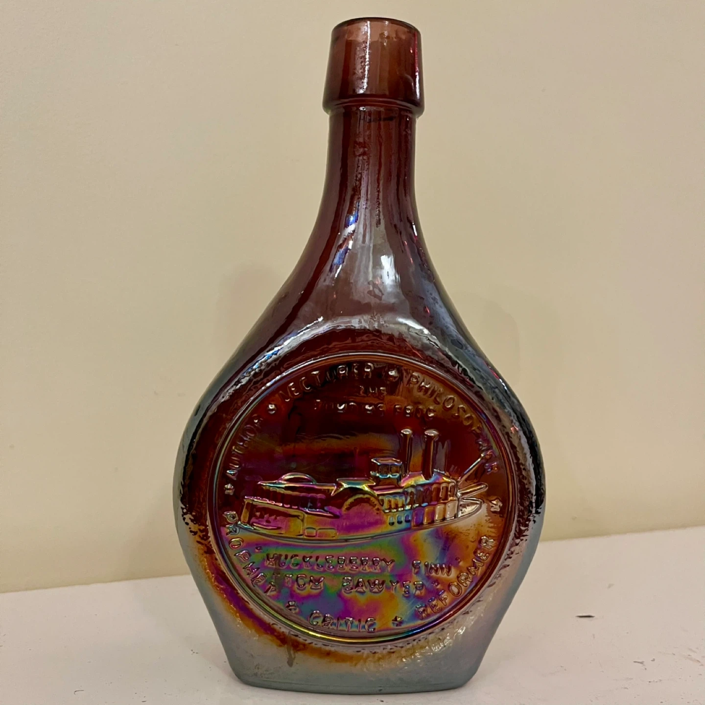 Stunning iridescent amethyst Wheaton Carnival Glass bottle featuring Mark Twain! This collector's piece is in good condition. This series was produced in the 1970's.