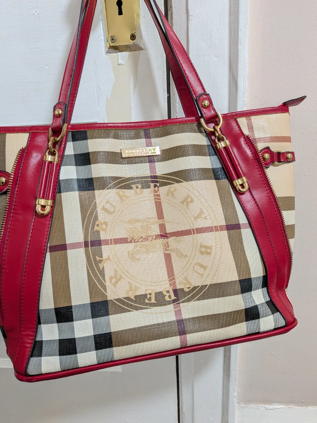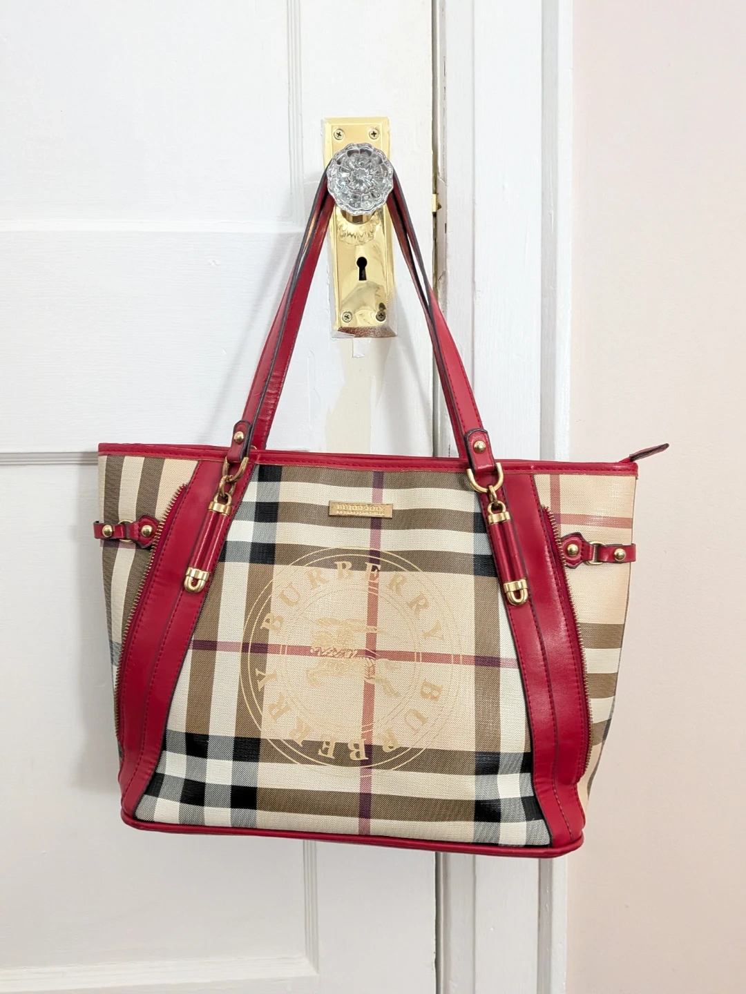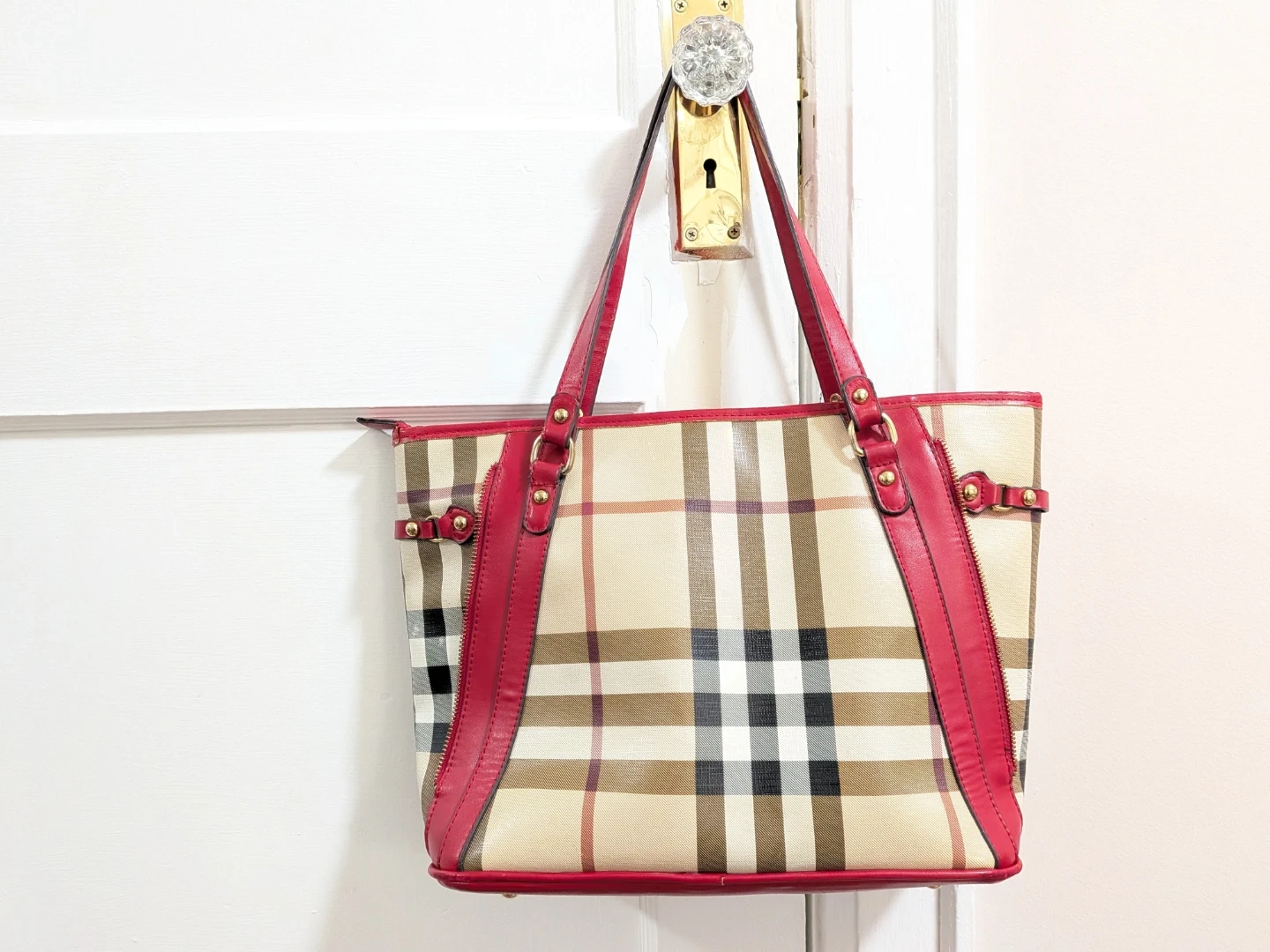 Selling a Burberry tote bag 2000-2017 collection coated canvas with a classic plaid pattern and striking red leather trim. It's in great condition and ready for a new owner.