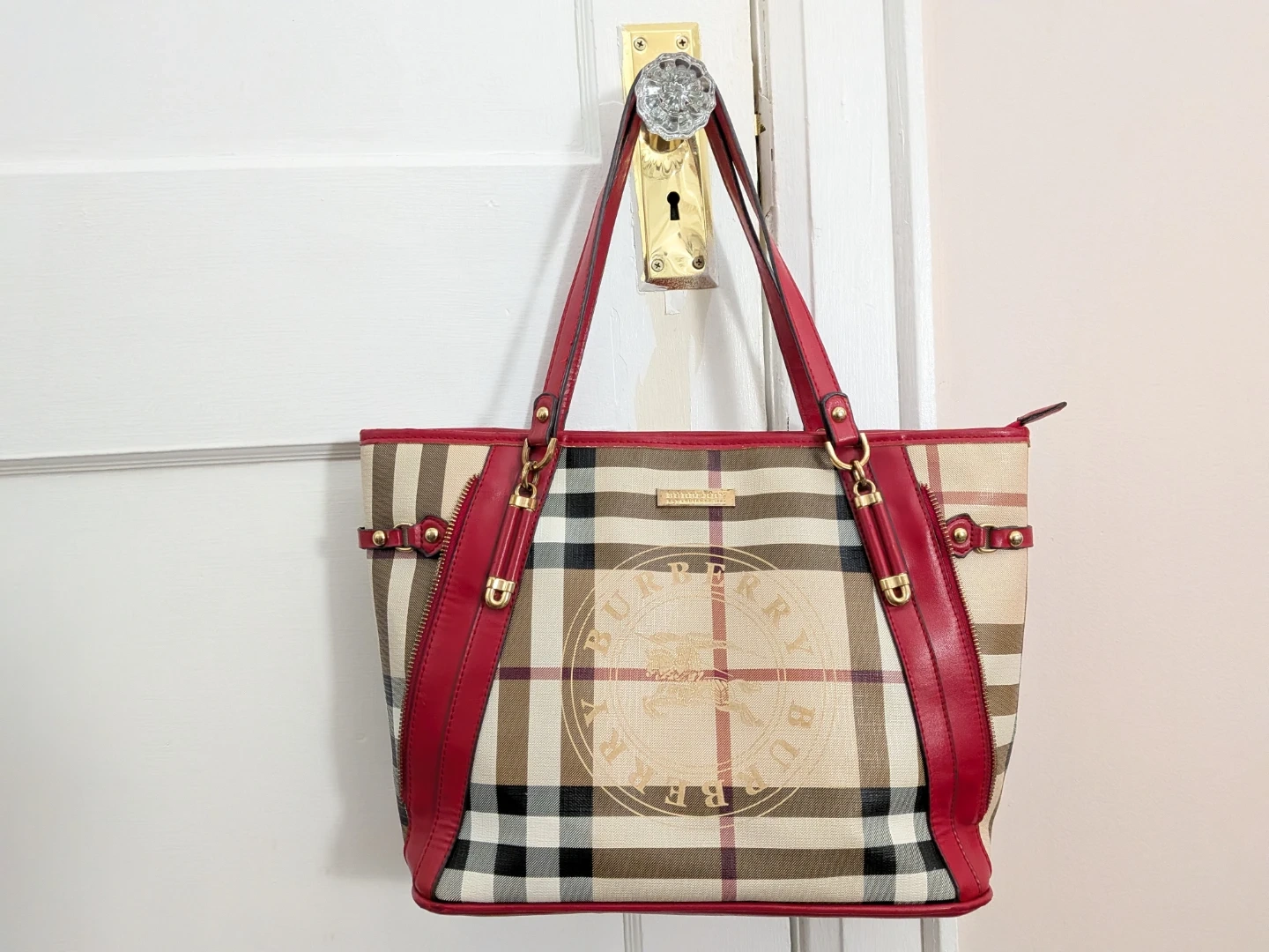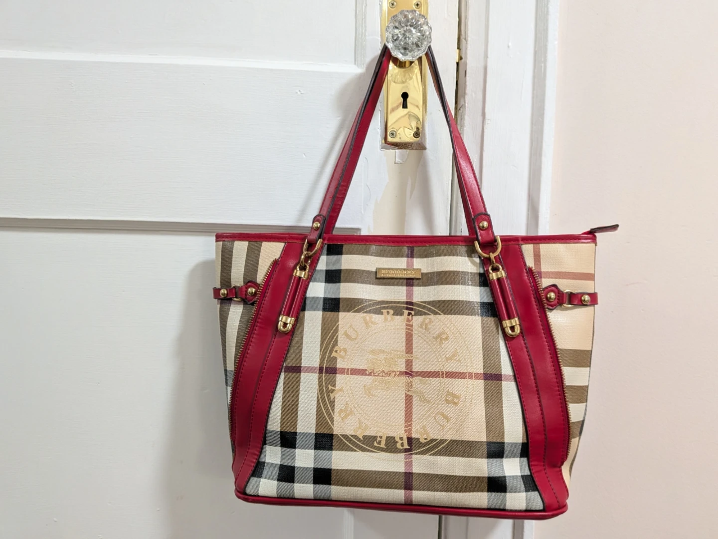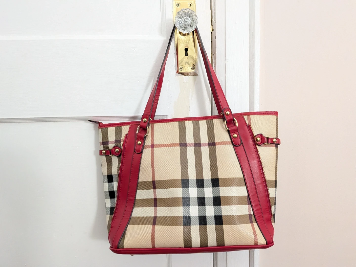 Selling a Burberry tote bag 2000-2017 collection coated canvas with a classic plaid pattern and striking red leather trim. It's in great condition and ready for a new owner.