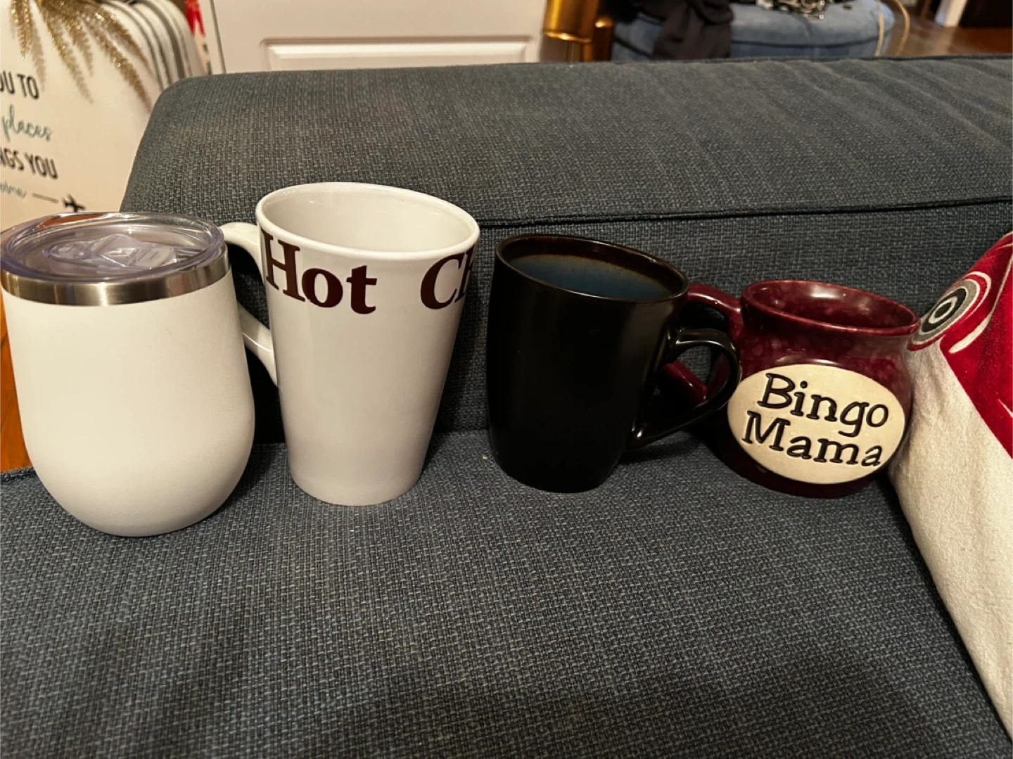 a set of assorted mugs! There's a white mug that says 'Hot Chocolate', a black mug, a maroon 'Bingo Mama' mug, and a white tumbler with a lid. Perfect for any beverage!