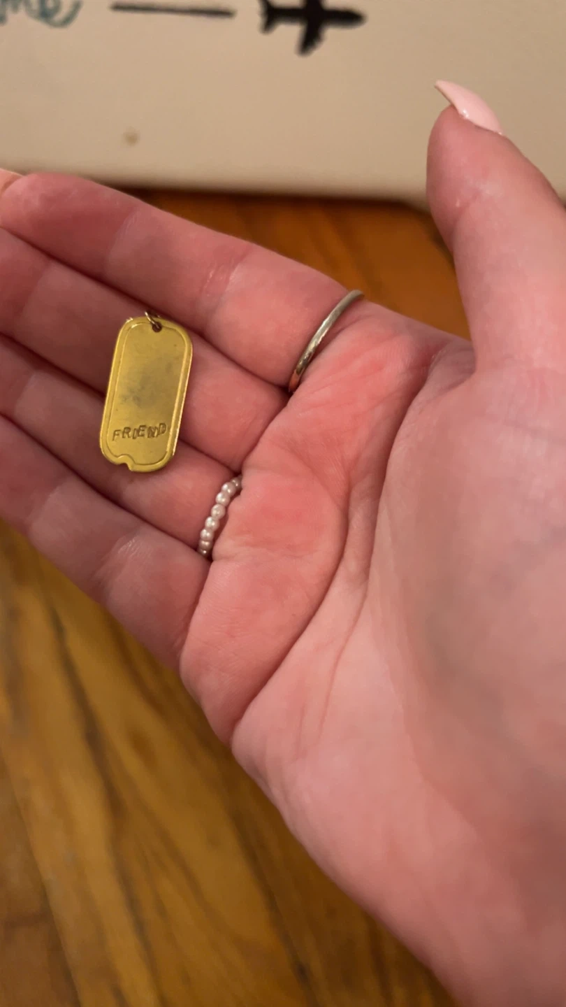 a cute little gold-coloured pendant. It's shaped like a dog tag and has the word 'Friend' on it. Perfect for adding a bit of charm to your style! #freecycle