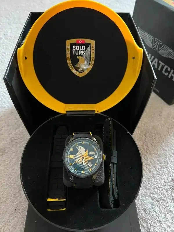 Limited edition (only 2011 made) Turkish Air Force Soloturk F16 watch. Comes with a special pilot helmet case and 2 spare belts. Watch is waterproof as well! No longer being sold or available anywhere. Highly collectible aviation watch. Pickup in Markham / Downtown Toronto