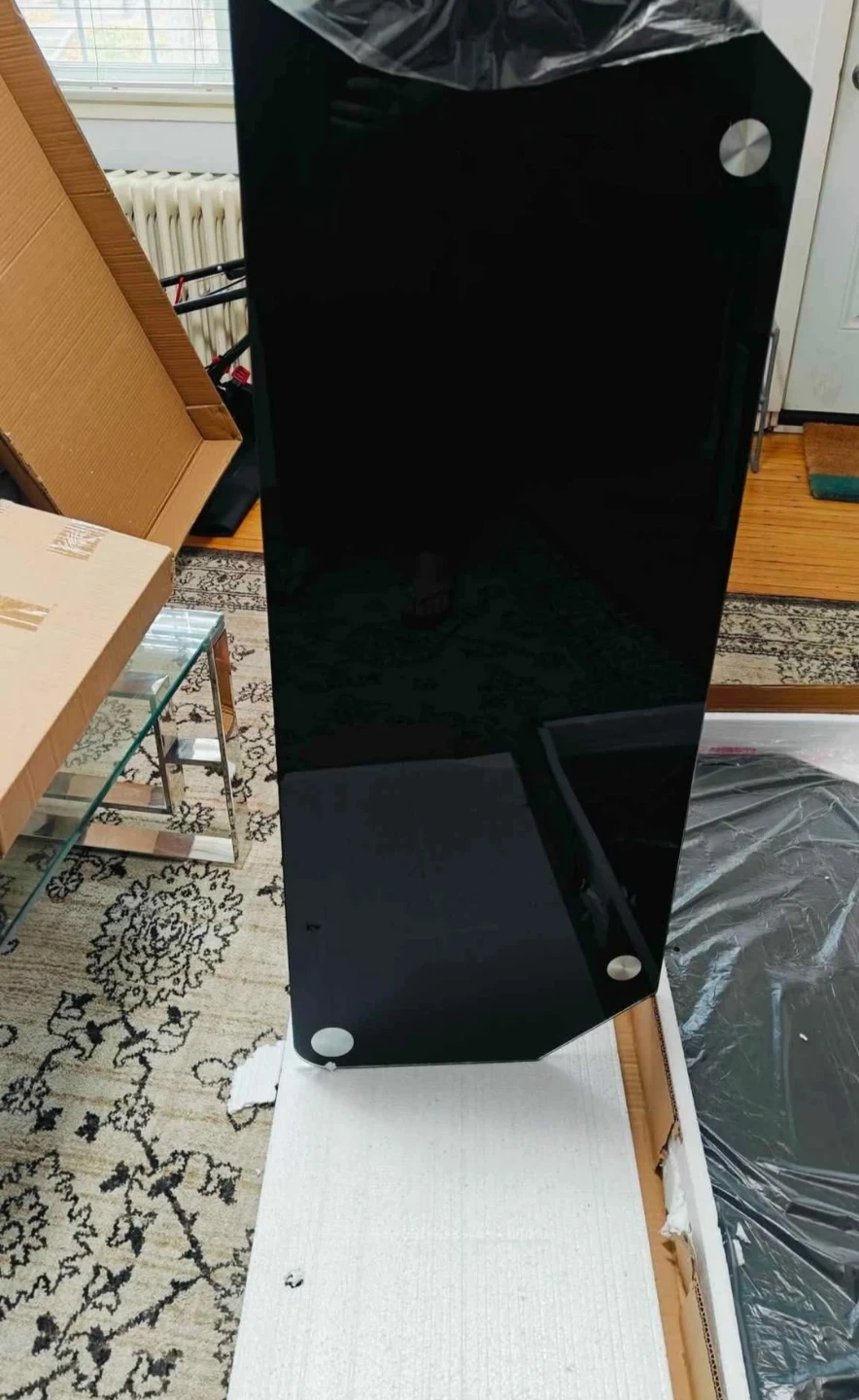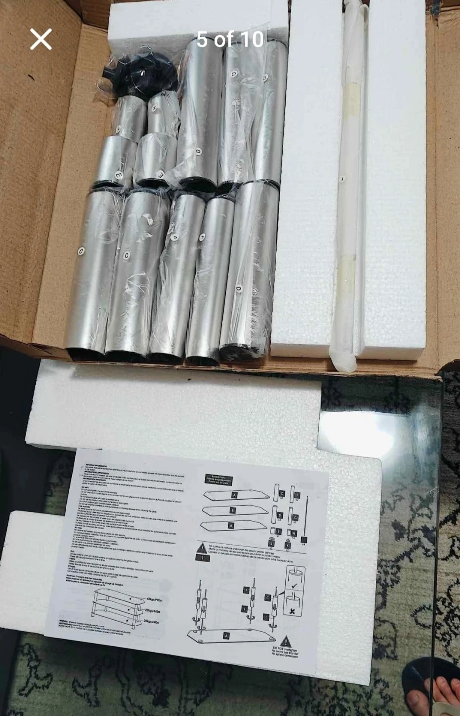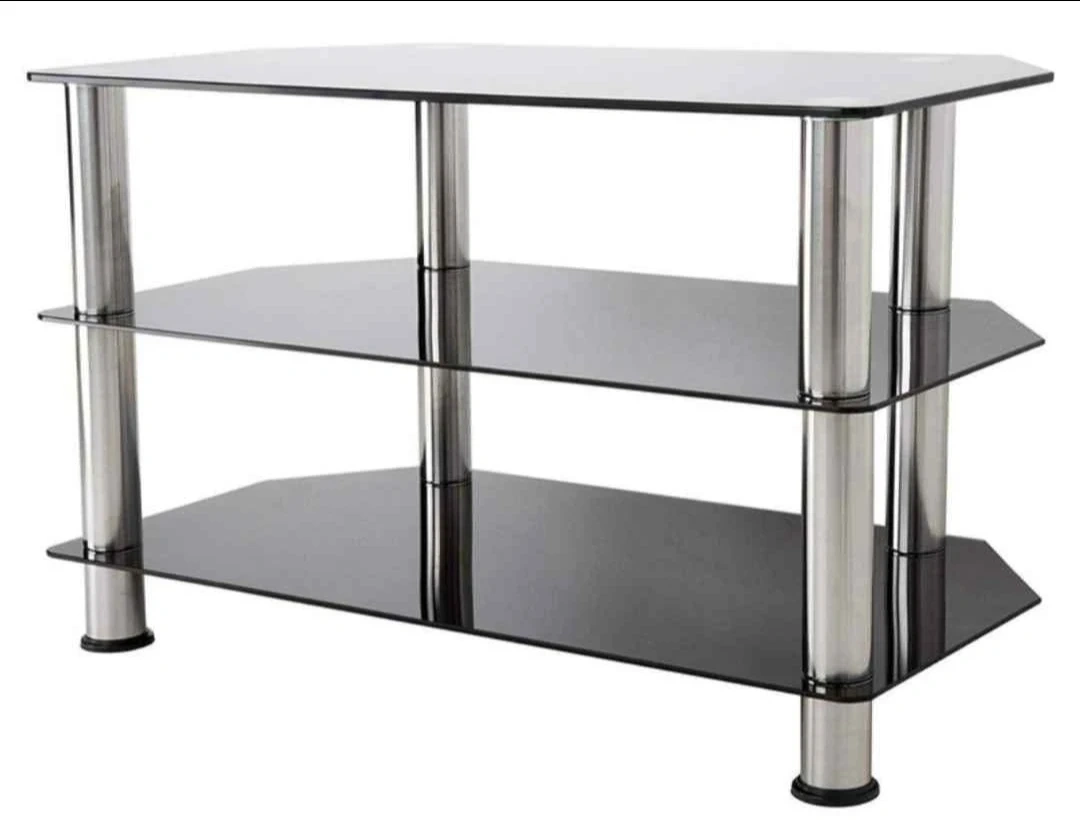 Selling a brand new black glass TV stand with silver legs. It's still in its original box and hasn't been assembled. All components and instructions are included, so it's ready to be set up in your home!