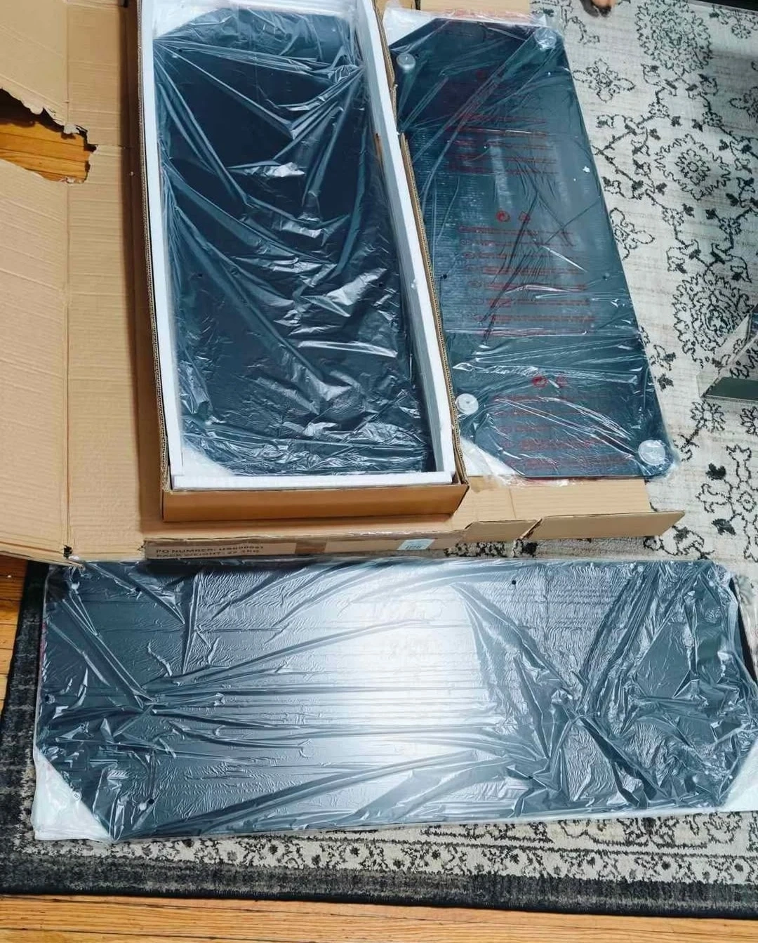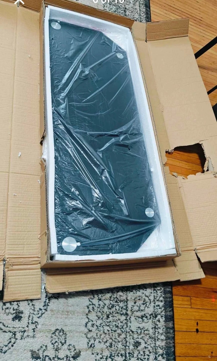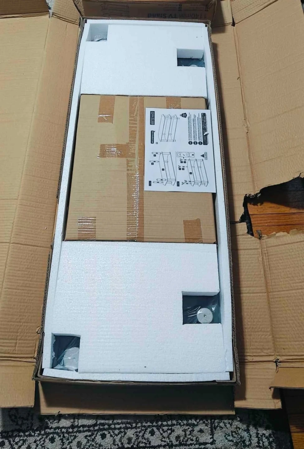 Selling a brand new black glass TV stand with silver legs. It's still in its original box and hasn't been assembled. All components and instructions are included, so it's ready to be set up in your home!