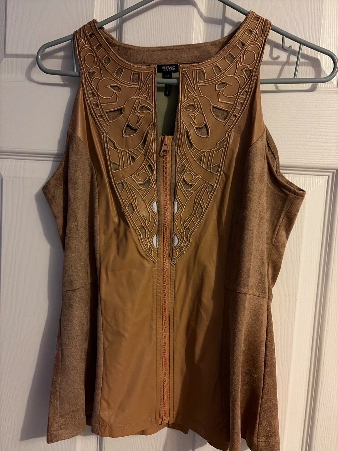 This Buffalo David Bitton tank is in excellent condition! It's a size M and features a unique faux suede design with intricate detailing. The material is 100% polyester coated with polyurethane. A stylish addition to any wardrobe!