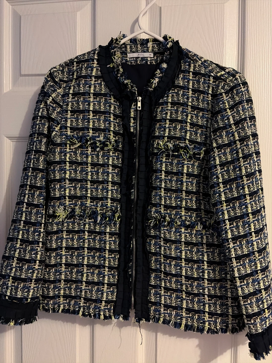 Selling a stylish edc tweed jacket! The jacket is a size 36 and features a unique design with a zipper closure. Perfect for adding a touch of sophistication to any outfit