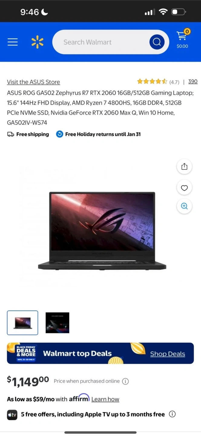 Selling an ASUS ROG GA502 Zephyrus gaming laptop. It features an AMD Ryzen 7 4800HS processor, 16GB DDR4, and a 512GB PCIe NVMe SSD. The graphics card is an NVIDIA GeForce RTX 2060 Max-Q. It also has a 15.6" 144Hz FHD display. Originally purchased for $1149