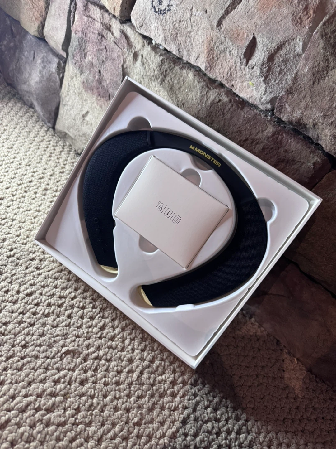 Selling a Monster G-V1 neck speaker in black! It's in great condition and comes with the box. Originally bought for $99.99. This is lightweight and portable, perfect for listening to music or podcasts on the go