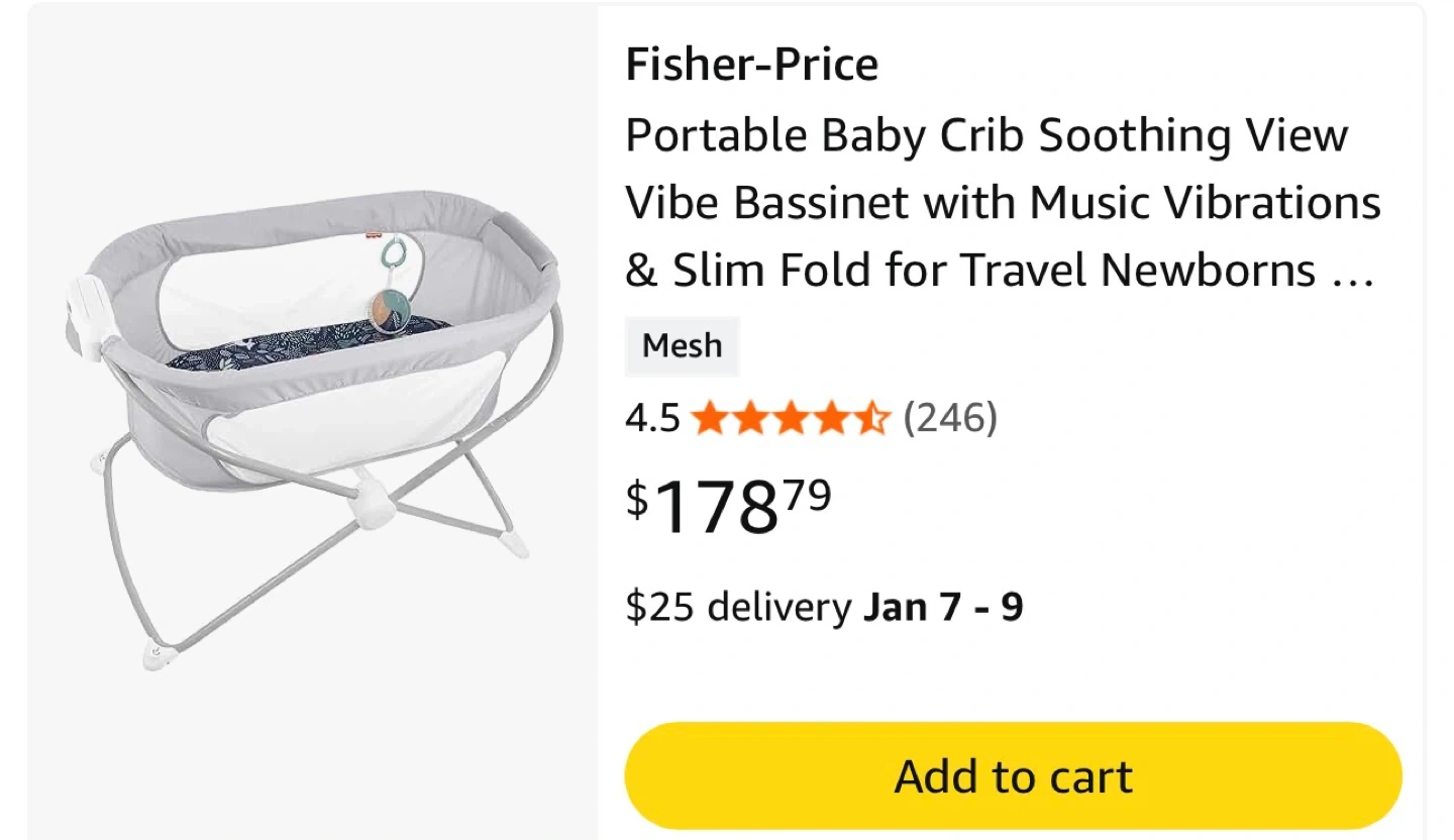 Selling a Fisher-Price Soothing View Bassinet in excellent condition! It's a portable baby crib with a slim fold, perfect for travel with newborns. The bassinet features breathable mesh sides and a removable, wipeable pad with a machine-washable sheet. It also has soothing vibrations and music to help your little one drift off to sleep. Originally bought for $178.79!