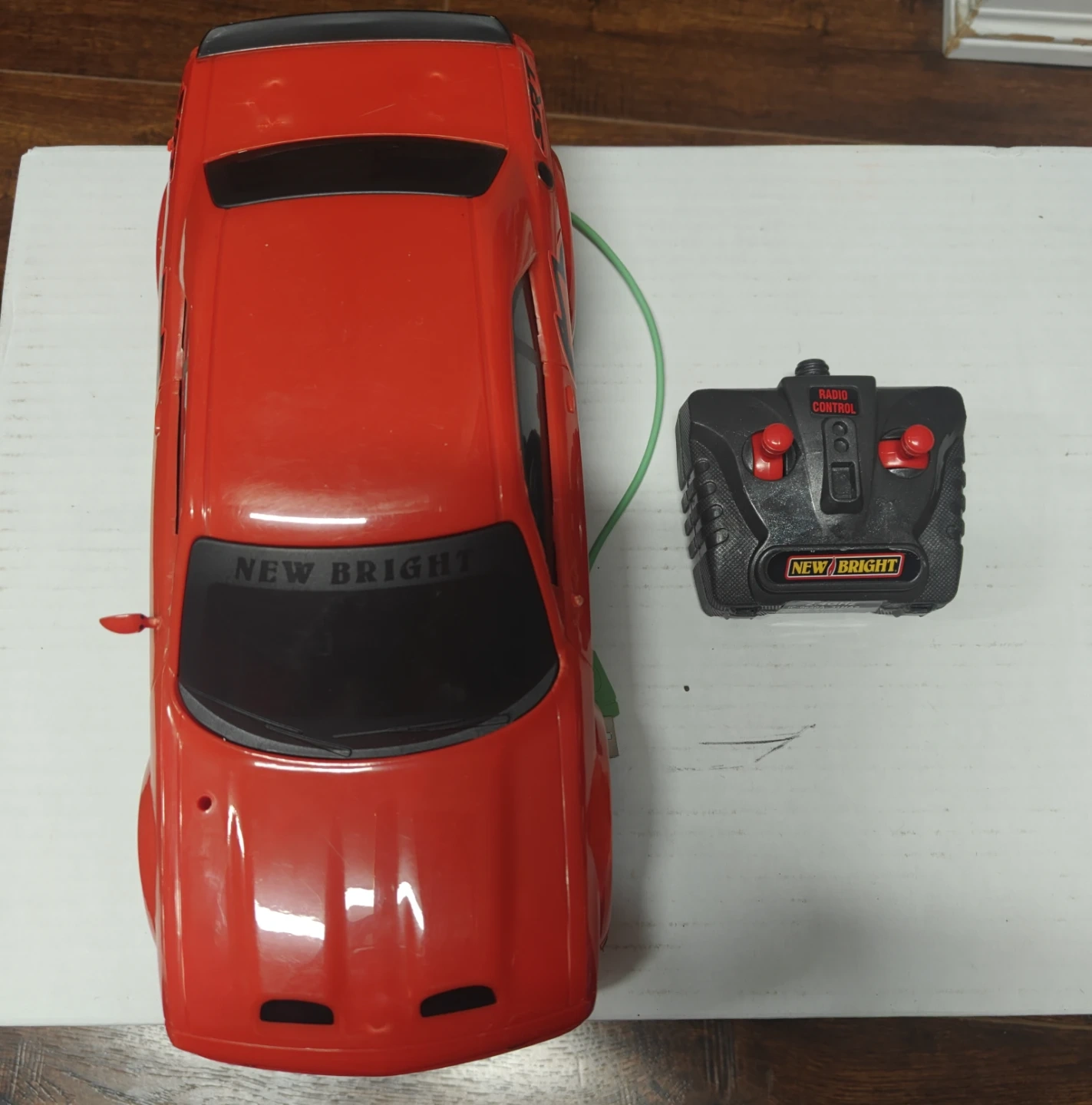 Check out this cool red radio control car from New Bright! It comes with the remote, so you're all set to start racing around