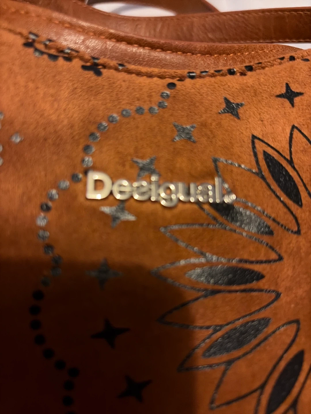Check out this stylish Desigual shoulder bag! It's a beautiful brown suede with unique black designs. Perfect for adding a touch of flair to any outfit