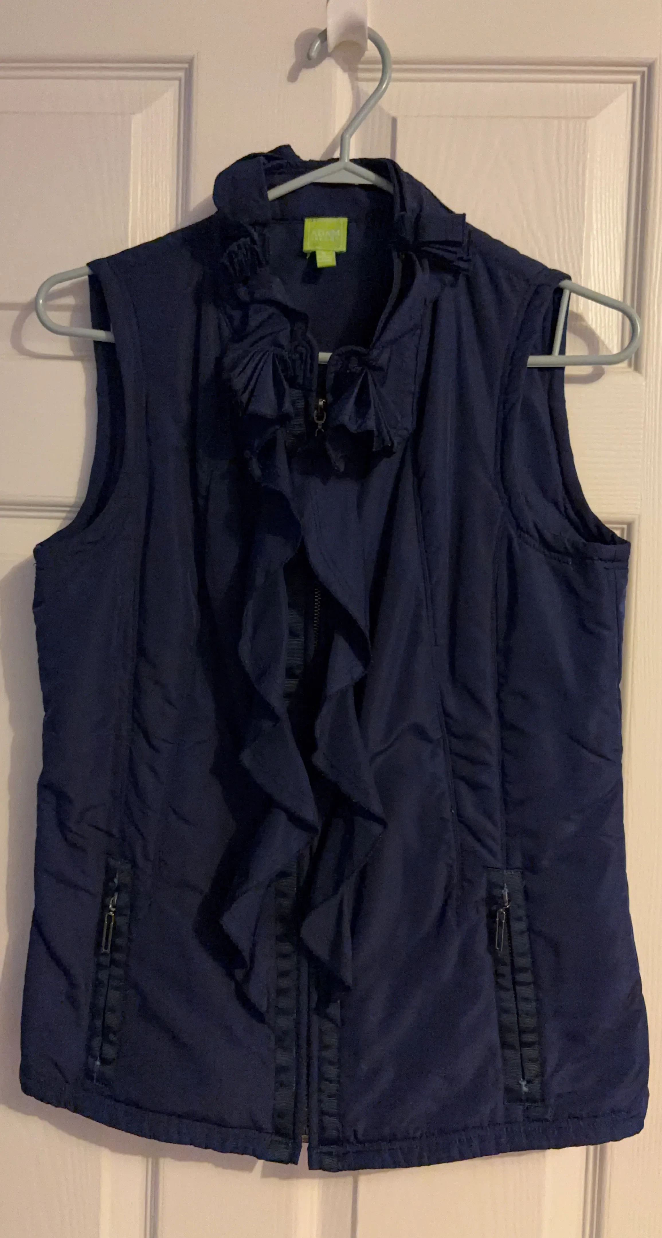 Selling a navy blue vest from Adam Lippes. It has a ruffled front and zipper pockets. Perfect for layering!