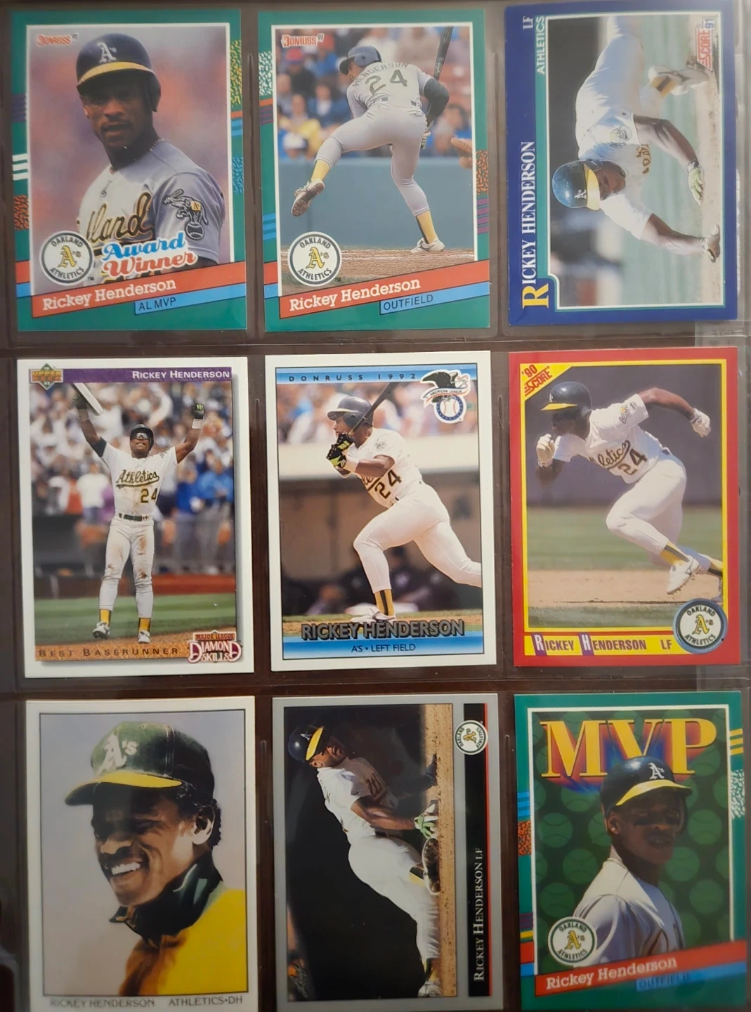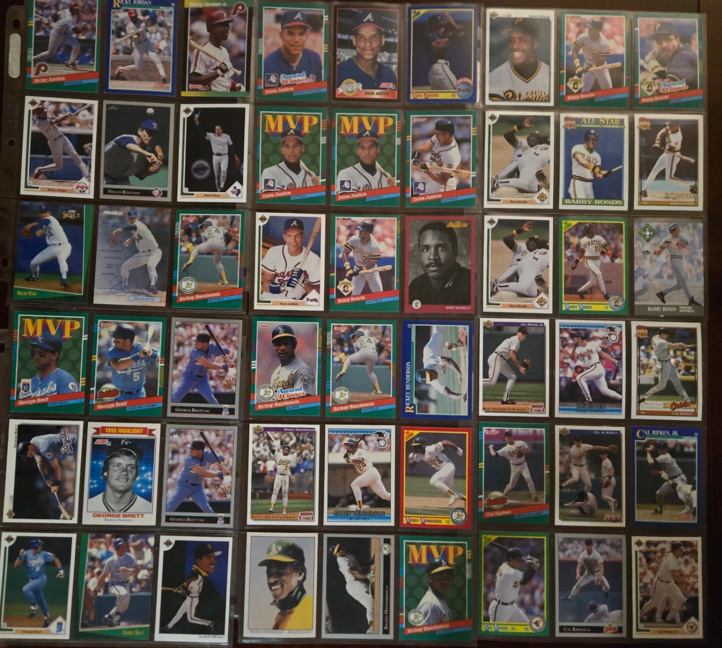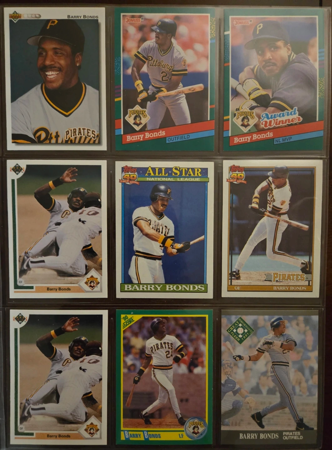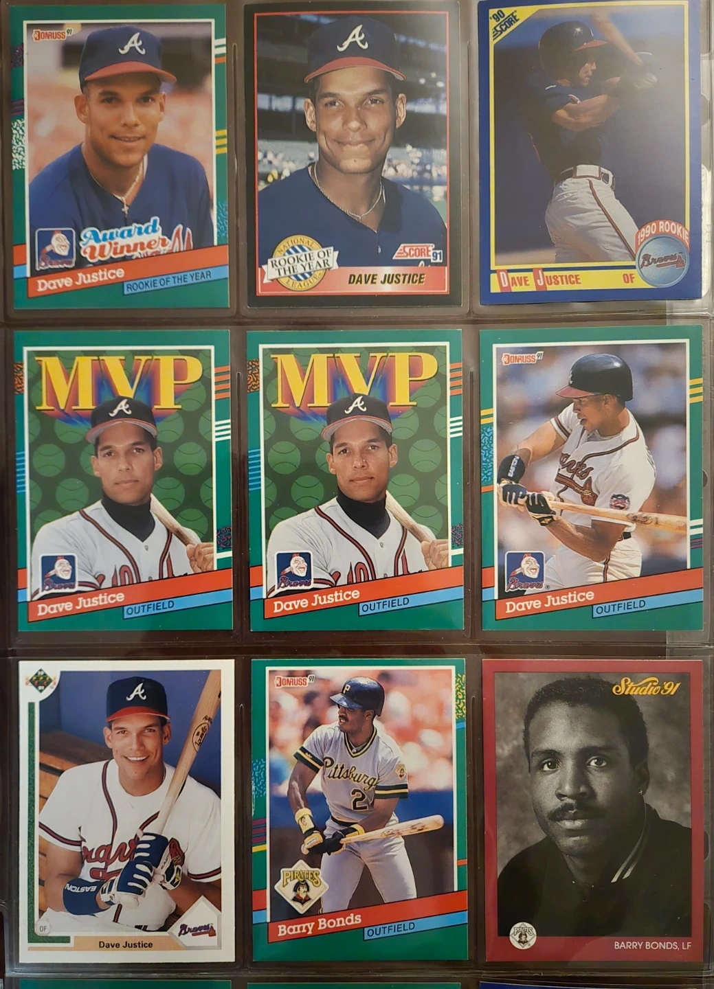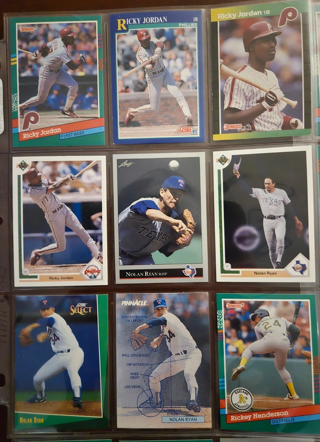 Selling a collection of vintage baseball cards featuring Barry Bonds, Nolan Ryan, Cal Ripken, Ricky Jordan RC, Dave Justice RC. and George Brett and Rickey Henderson. 54 Card Lot. ALL NRMT-MT Great for collectors!