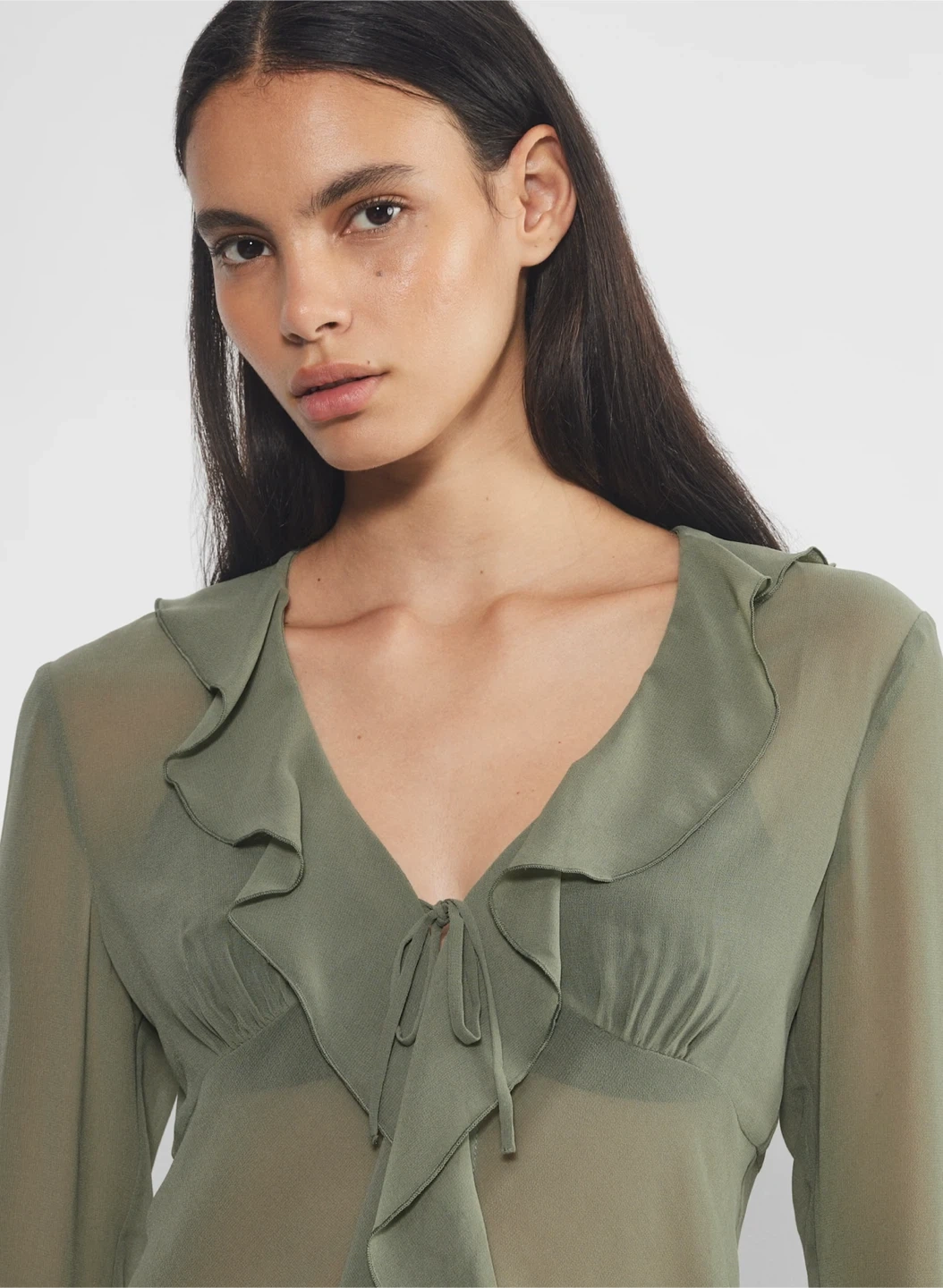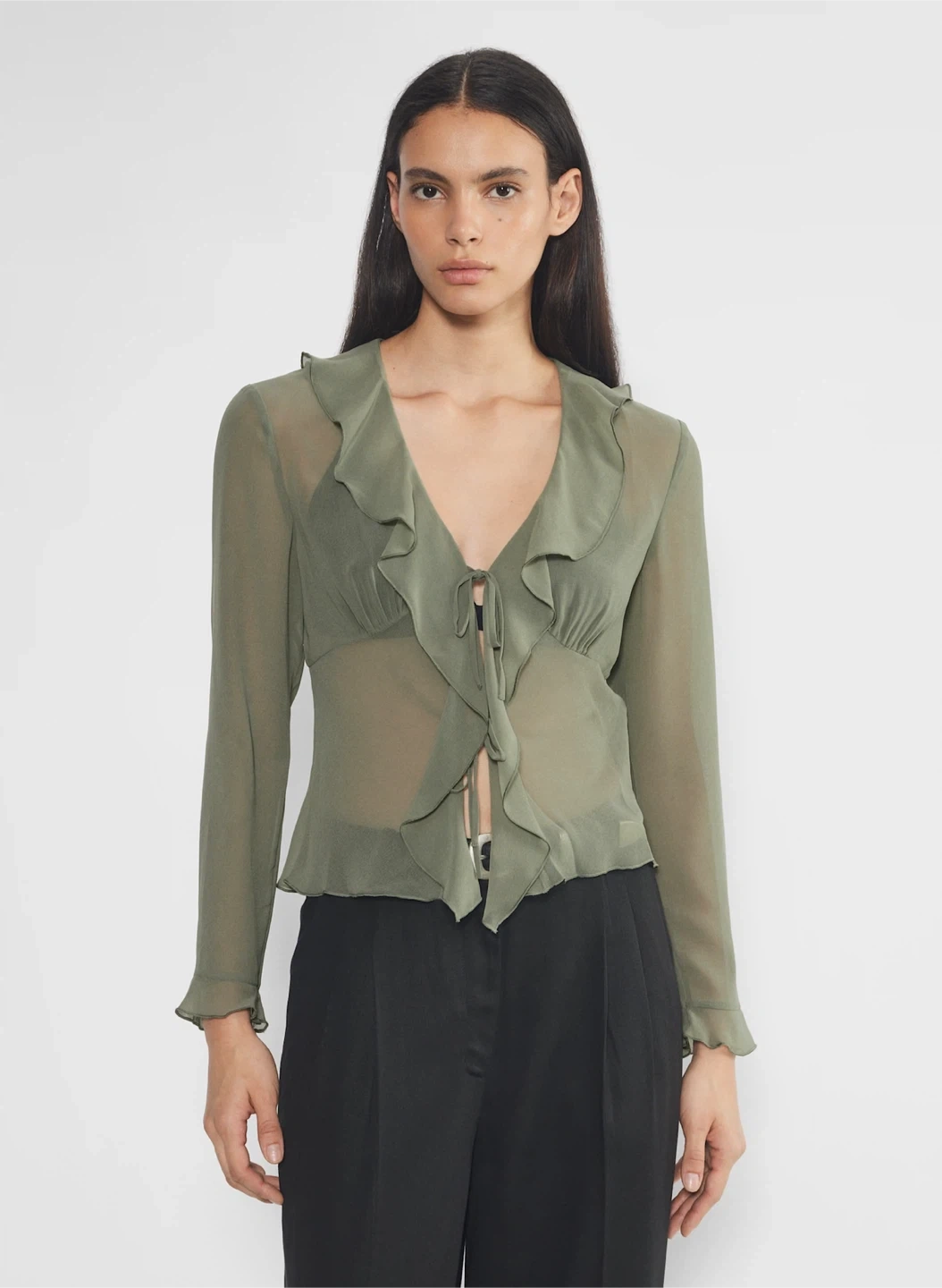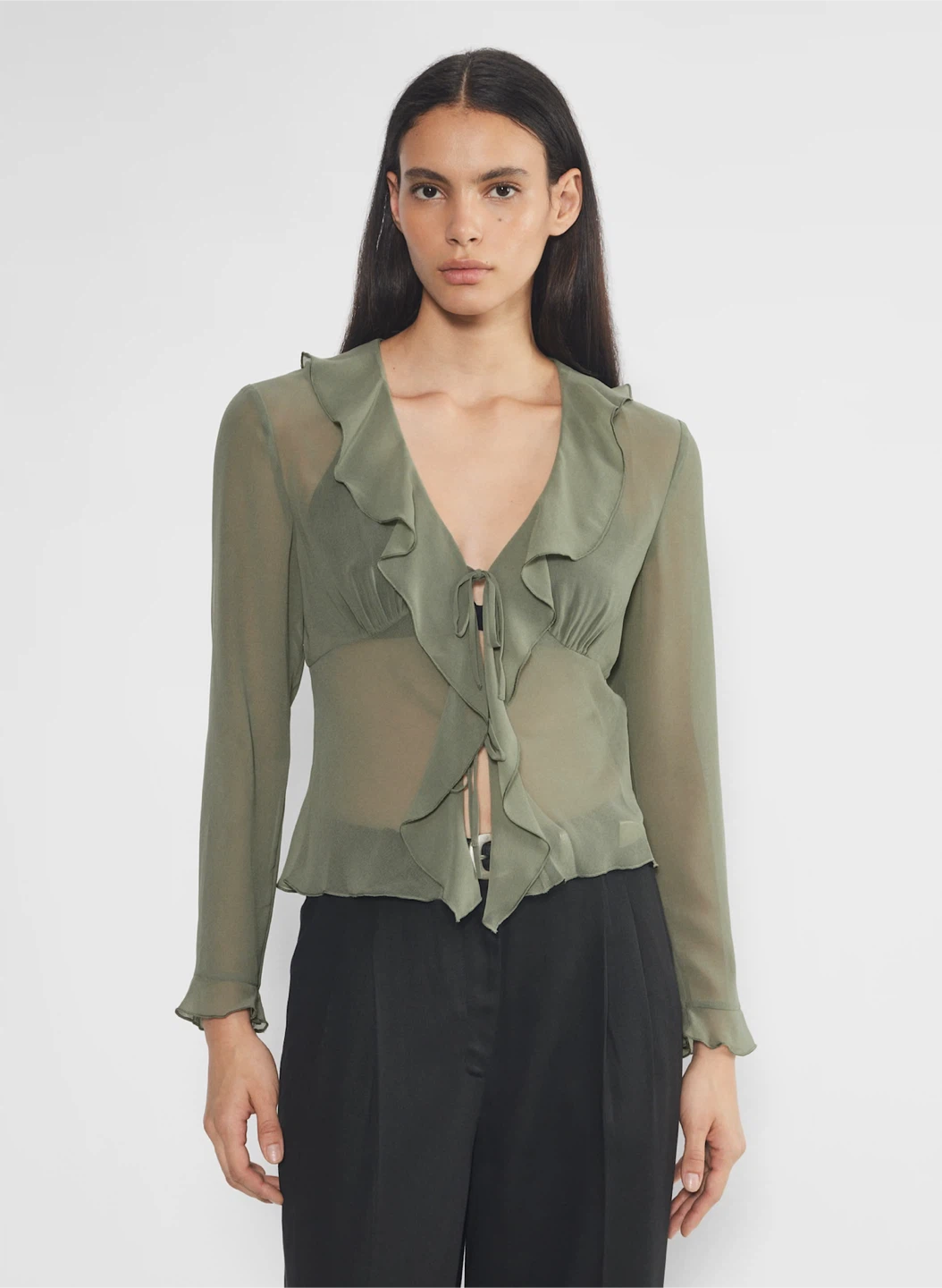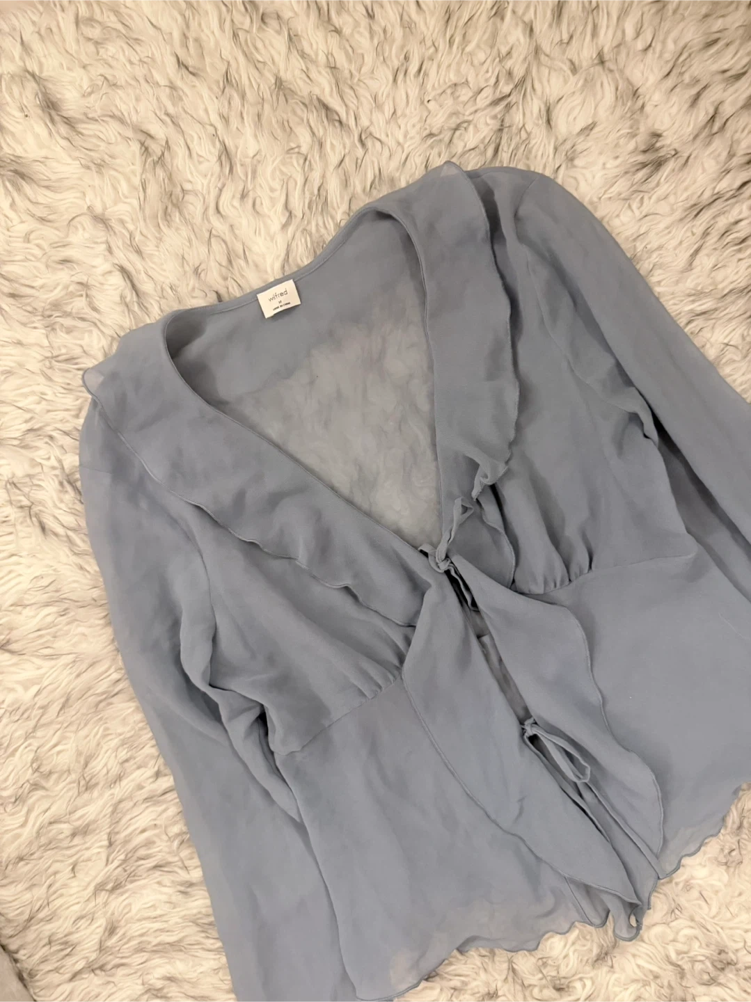 A ruffle effect. This is a V-neck blouse with ruffled edges and a tie closure. It’s made with Fête Chiffon — lightweight, semi-sheer fabric with an ethereal drape that’s made from 100% recycled materials.