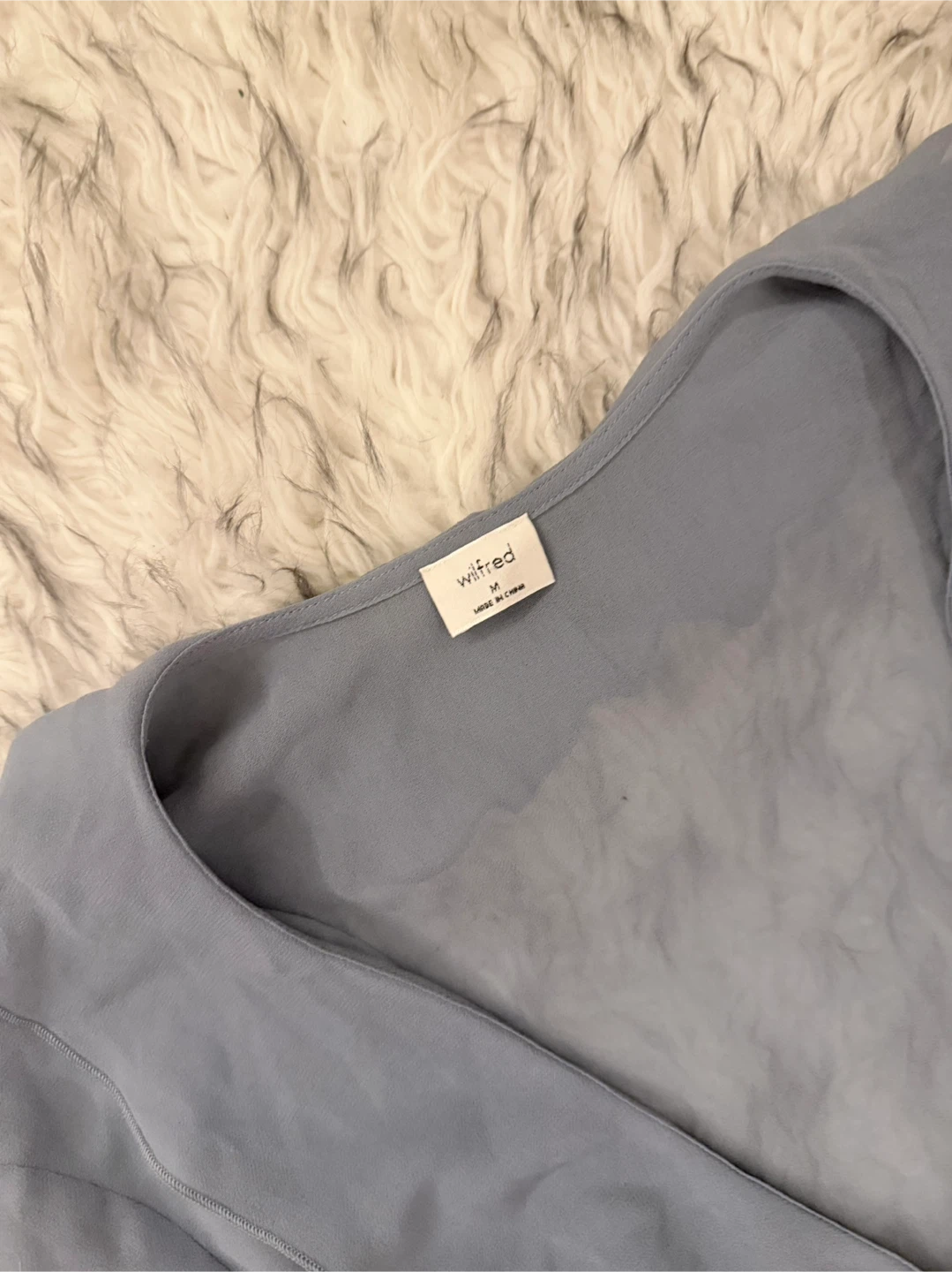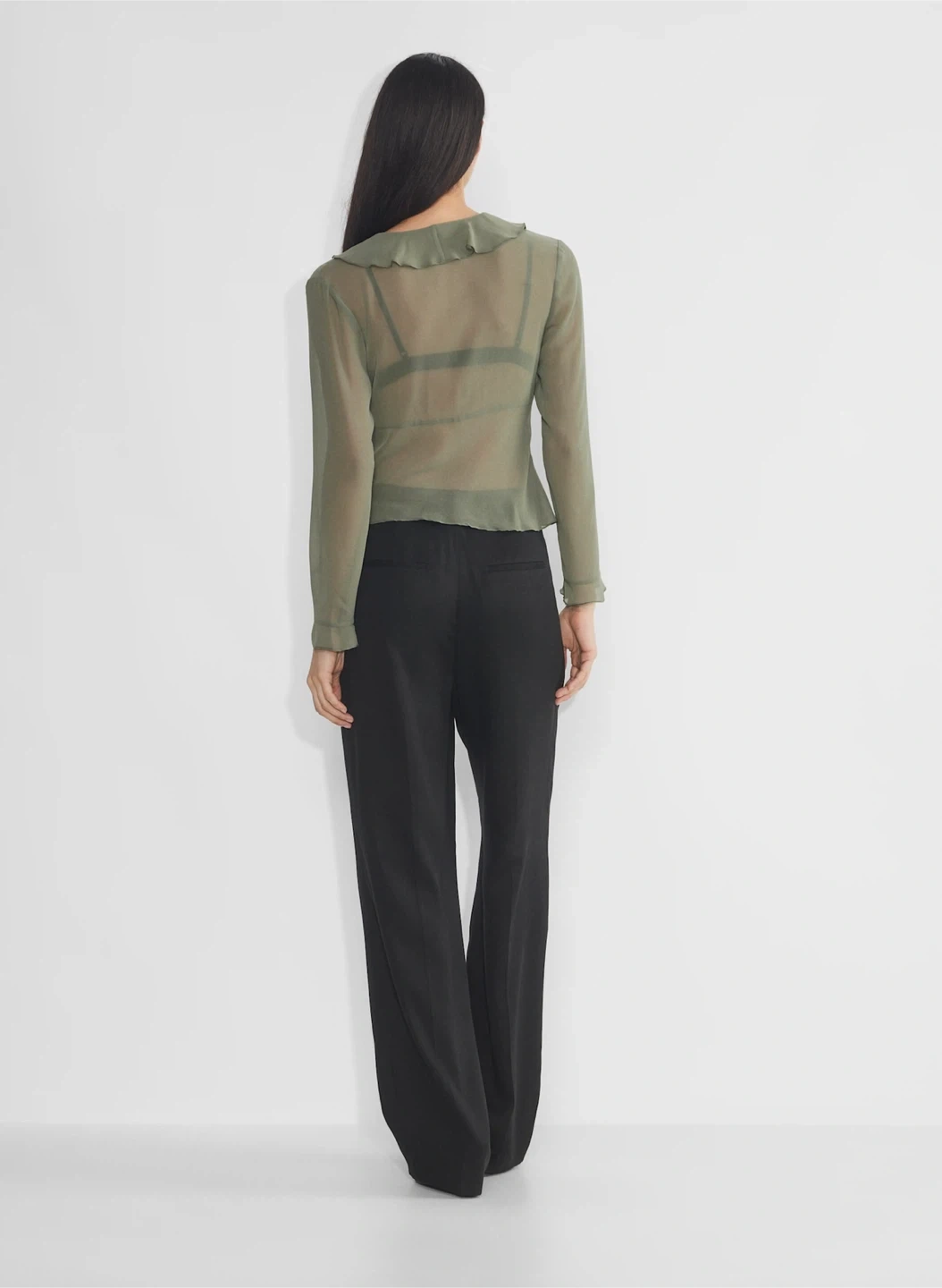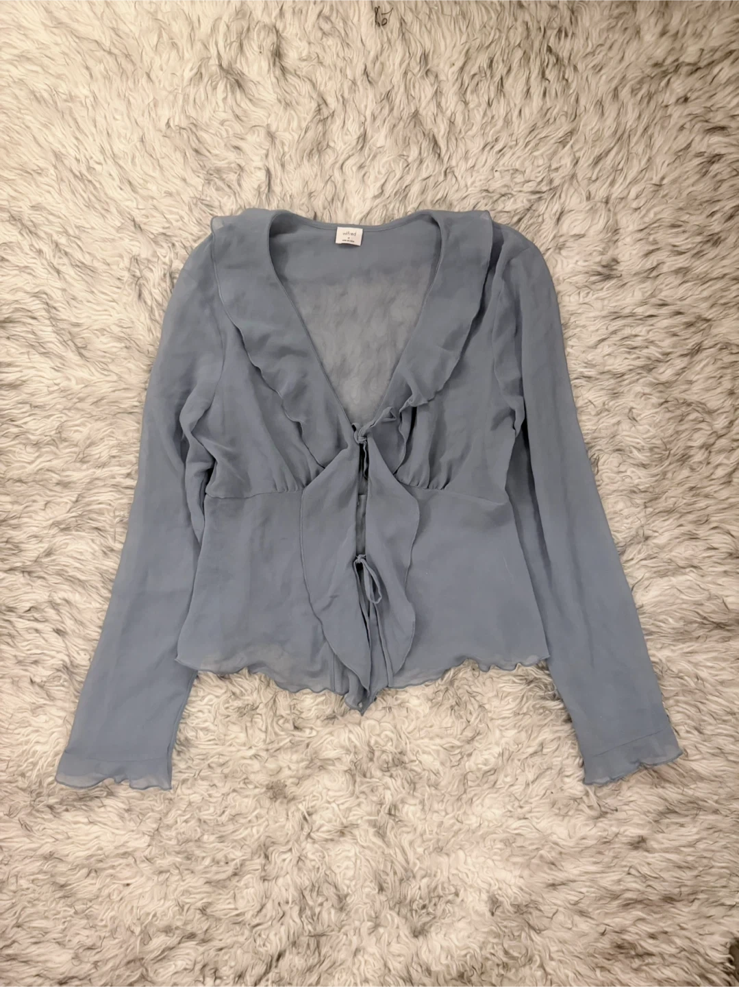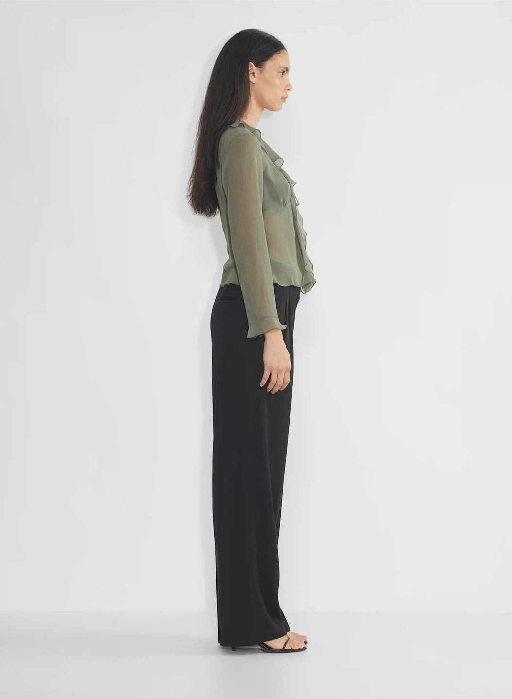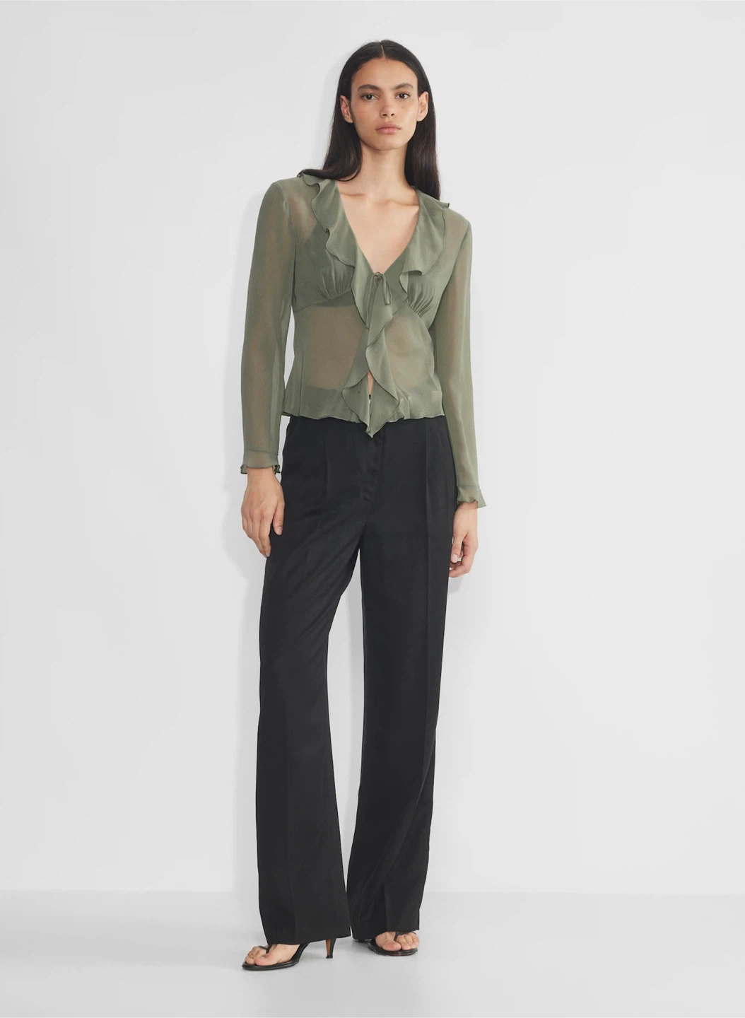 A ruffle effect. This is a V-neck blouse with ruffled edges and a tie closure. It’s made with Fête Chiffon — lightweight, semi-sheer fabric with an ethereal drape that’s made from 100% recycled materials.