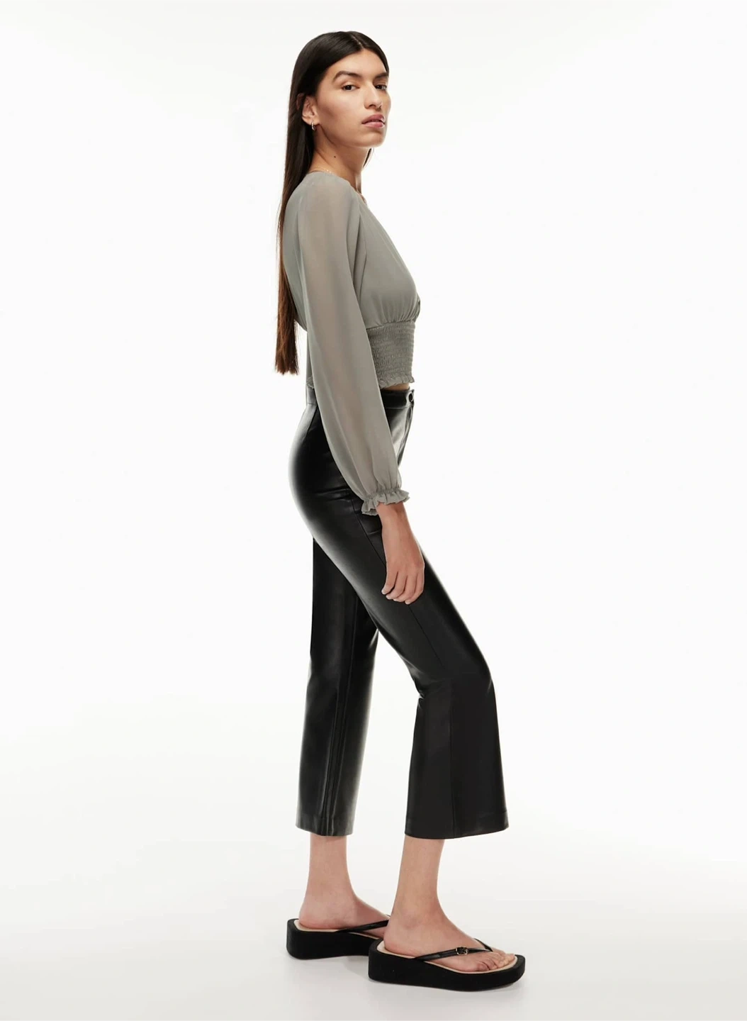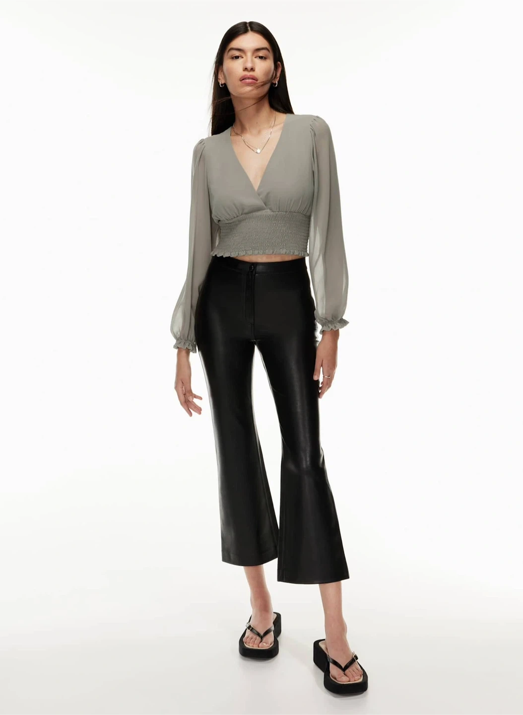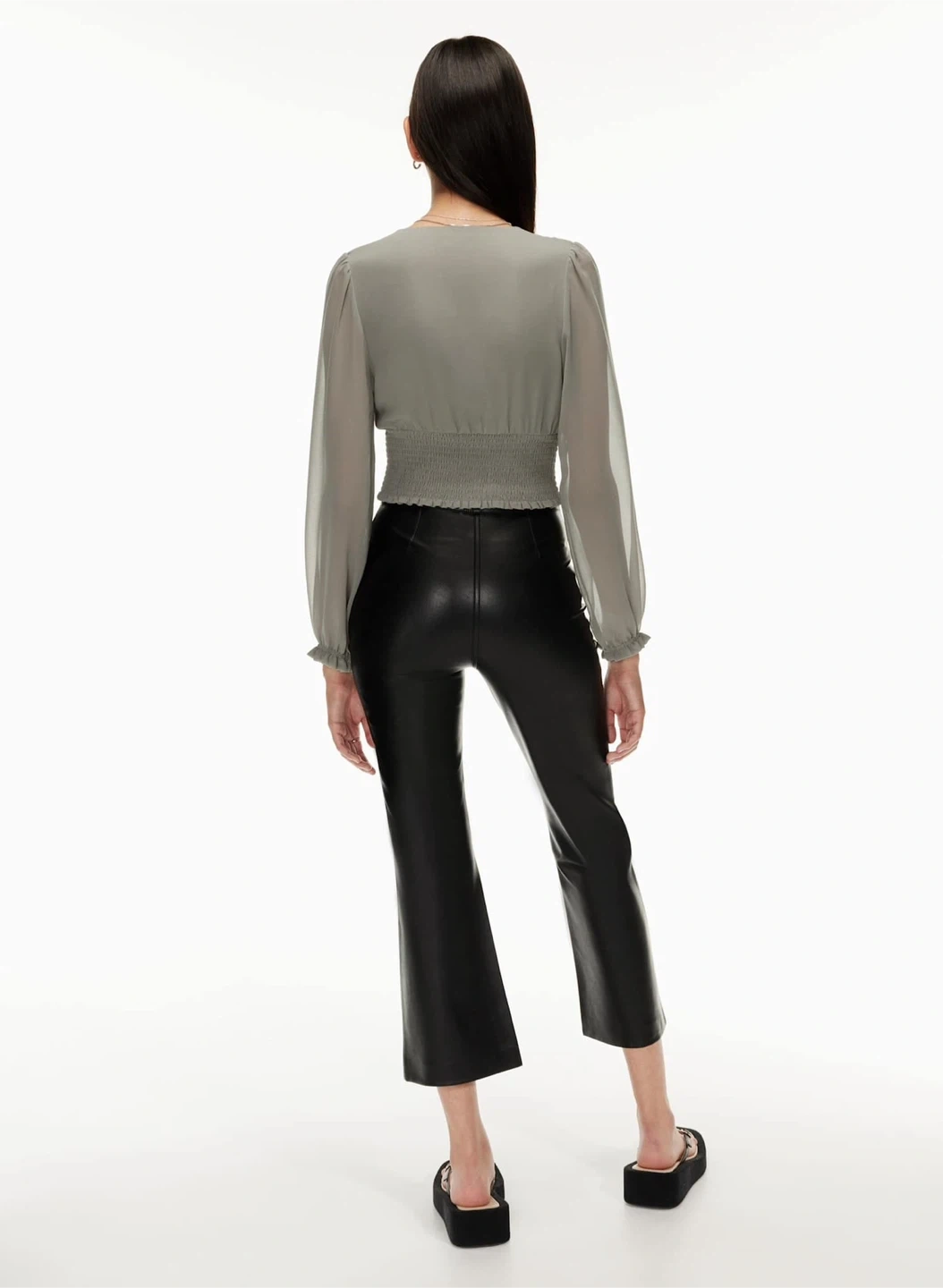 The genre is "romantic pastoral". This is a V-neck blouse with long sheer sleeves, a smocked bodice and ruffled edges. It’s made with Fête Chiffon — lightweight, semi-sheer fabric with an ethereal drape.