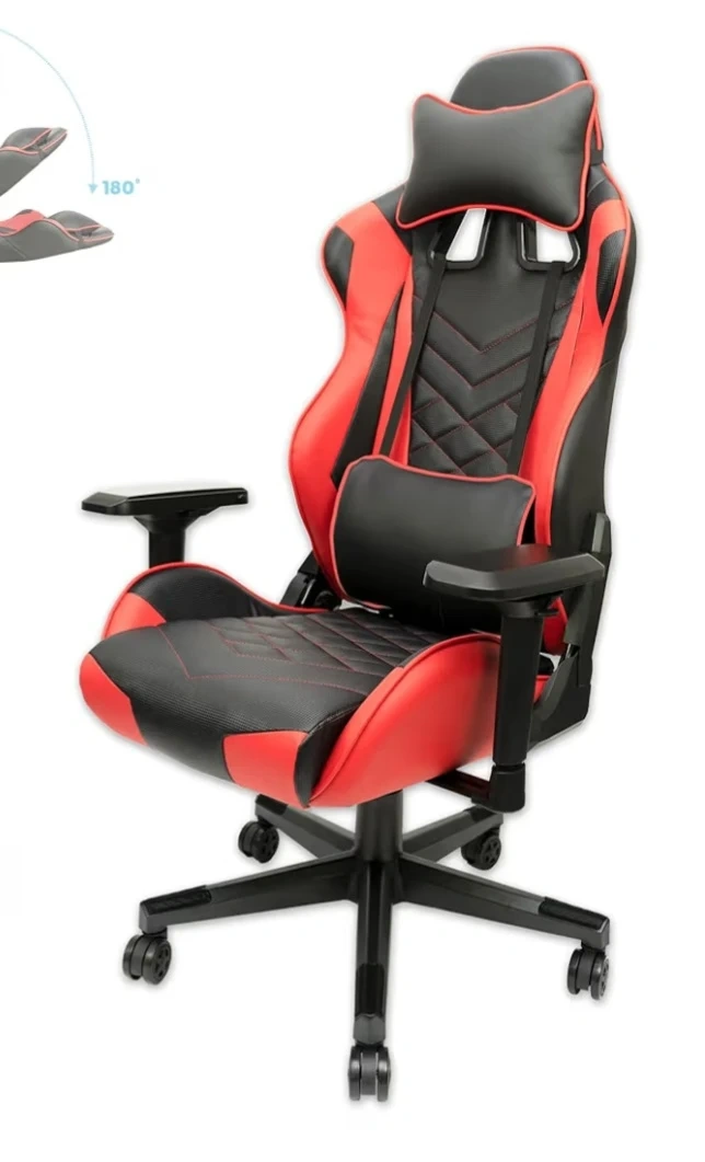 Selling a red and black gaming chair. It includes a headrest cushion. The synthetic leather on the seat has some cracks, but it still works perfectly fine and looks good.