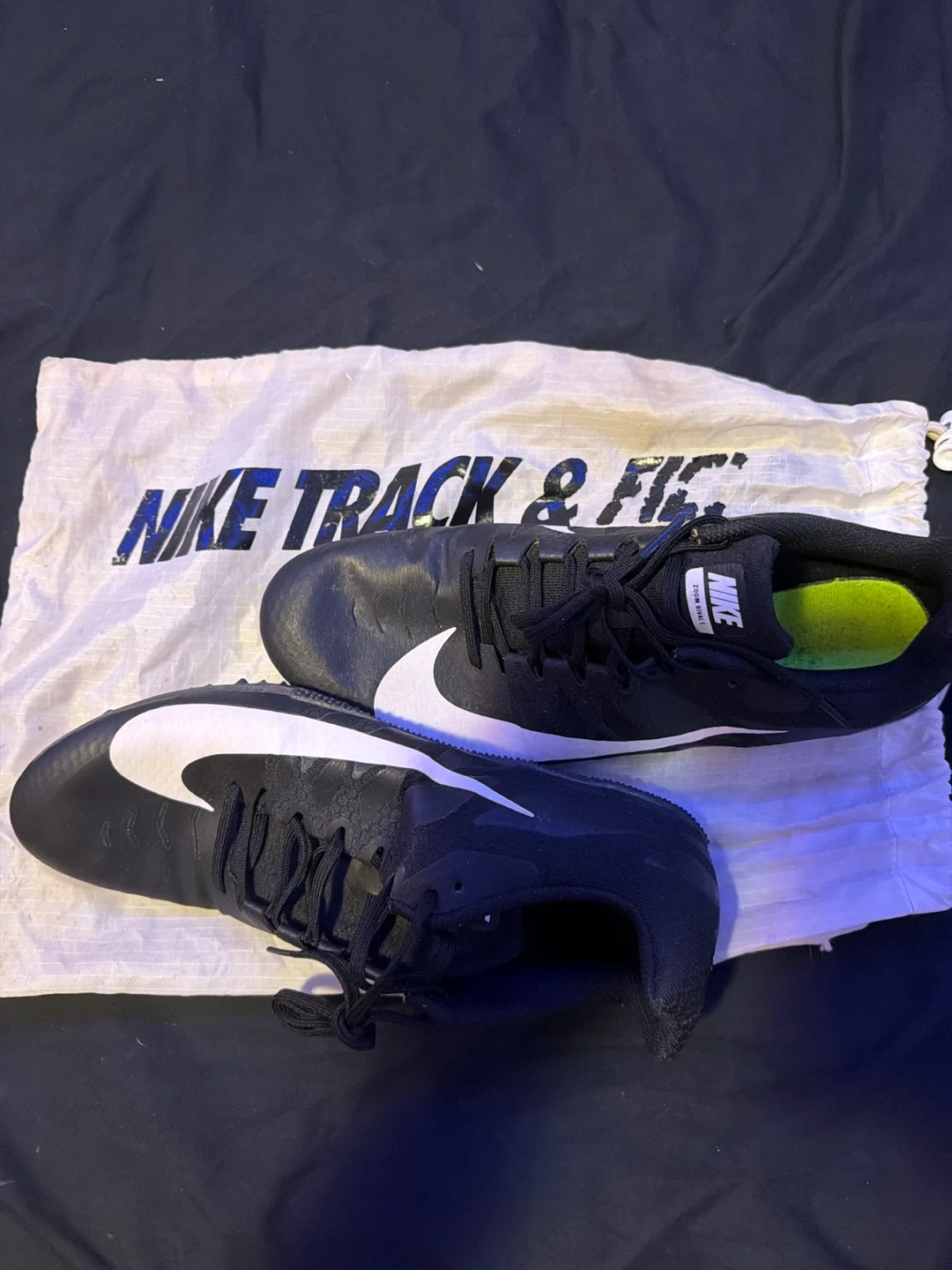 Selling a pair of Nike Zoom Rival track and field shoes. They are black with a white Nike swoosh. Comes with the Nike Track & Field bag