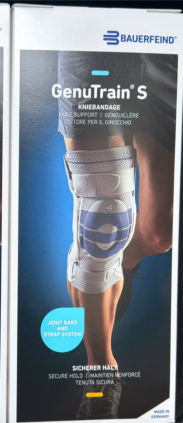 Selling a Bauerfeind GenuTrain S knee support. This knee support features joint bars and a strap system for a secure hold. It's designed to provide support and stability for your knee during activities. If you're looking for a reliable knee brace, this could be a great option!