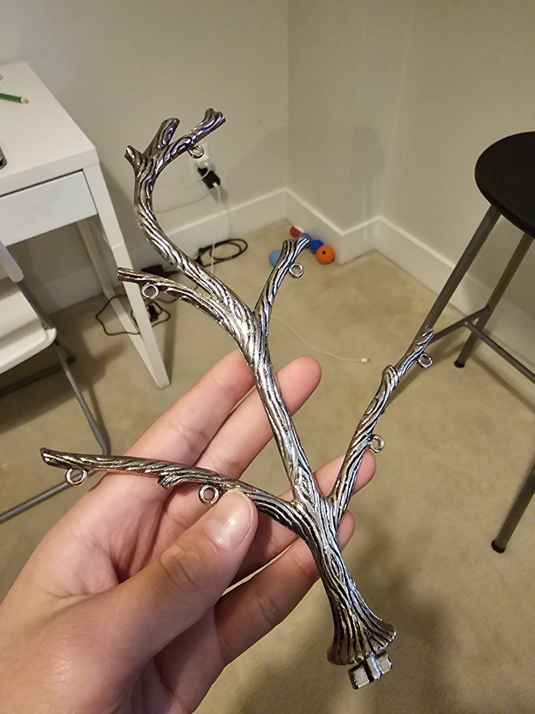 Selling a silver-toned jewelry holder in the shape of a tree! It's perfect for hanging necklaces, bracelets, and earrings. It's in great condition and ready to organize your jewelry collection
