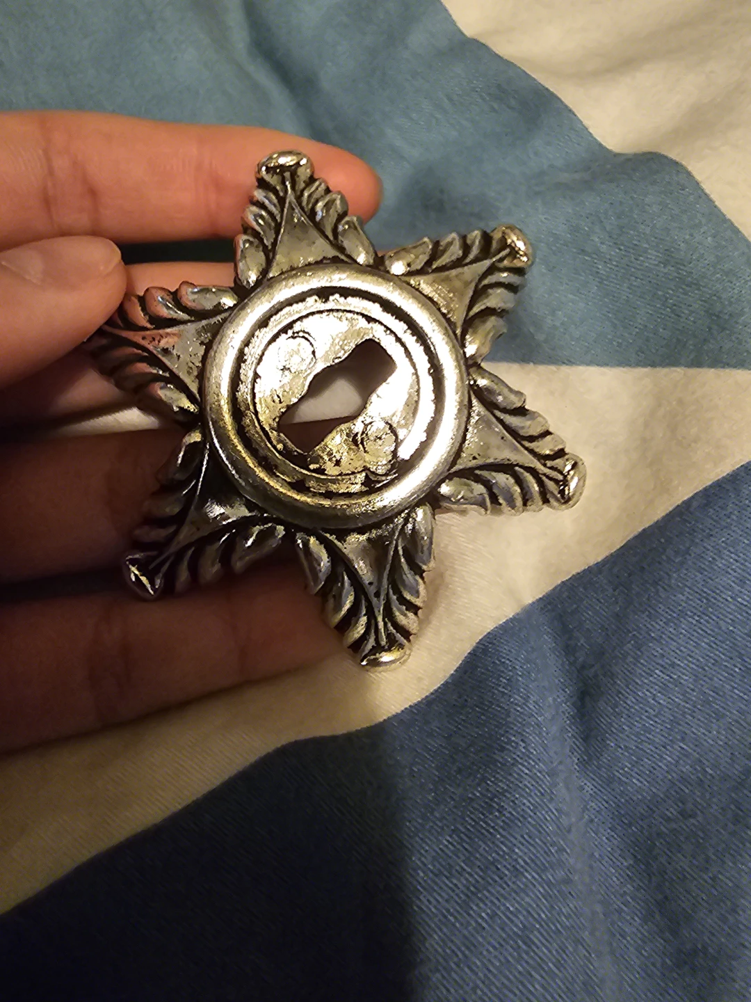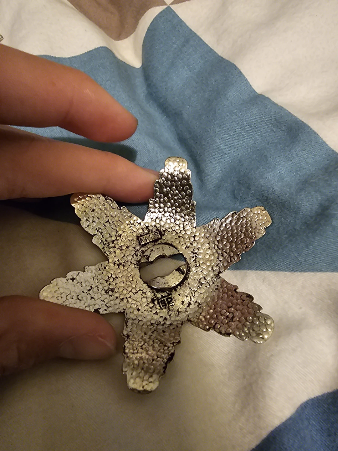 Selling a star shaped metal ornament. It has a detailed design on the front and a textured back. It shows signs of wear.