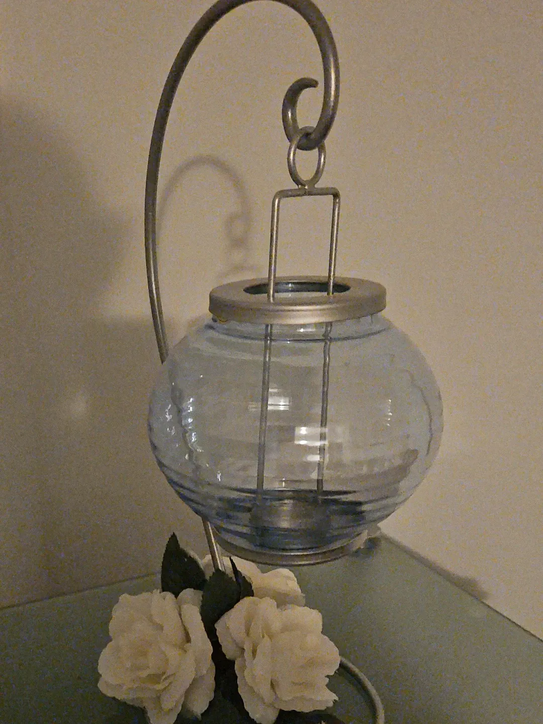 This is a charming glass hanging candle lantern. It features a delicate glass globe and a sturdy metal frame. Perfect for adding a touch of warmth and ambiance to any room! It also comes with some decorative flowers.