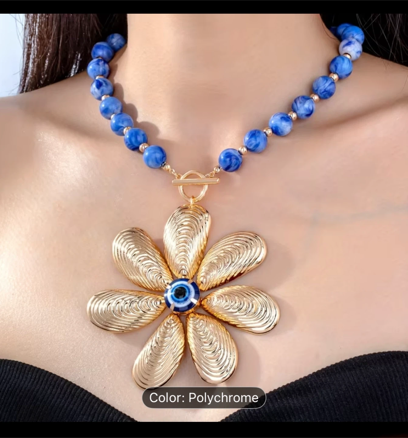 This is a beautiful necklace with polychrome-coloured beads and a large golden flower pendant. The flower has a blue and white 'evil eye' design in the centre. It's a unique piece that will add a pop of colour to any outfit