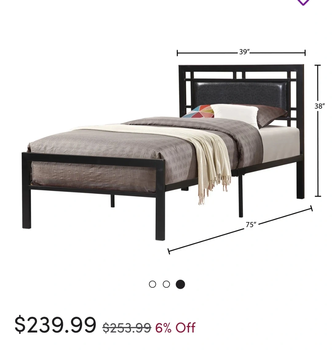 Selling a twin size metal bed frame in black. The dimensions are 39" x 75". The headboard height is 38". Originally bought for $239.99