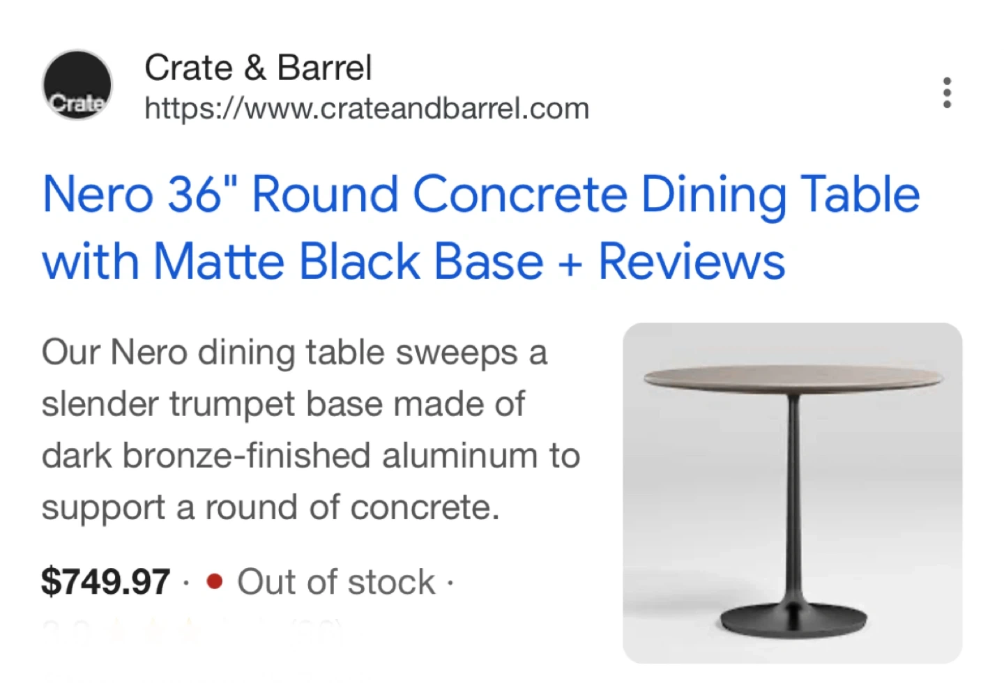 Selling a Crate & Barrel Nero 36" round dining table. It features a concrete top and a matte black base. The color is no longer available in store