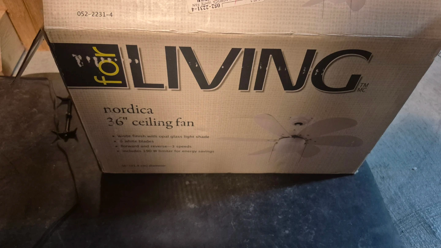 Selling a brand new Nordica 36" ceiling fan, still in its original box! It features a white finish with an opal glass light shade and 5 white blades. It also has forward and reverse 3 speeds, and includes a 190 W limiter for energy savings