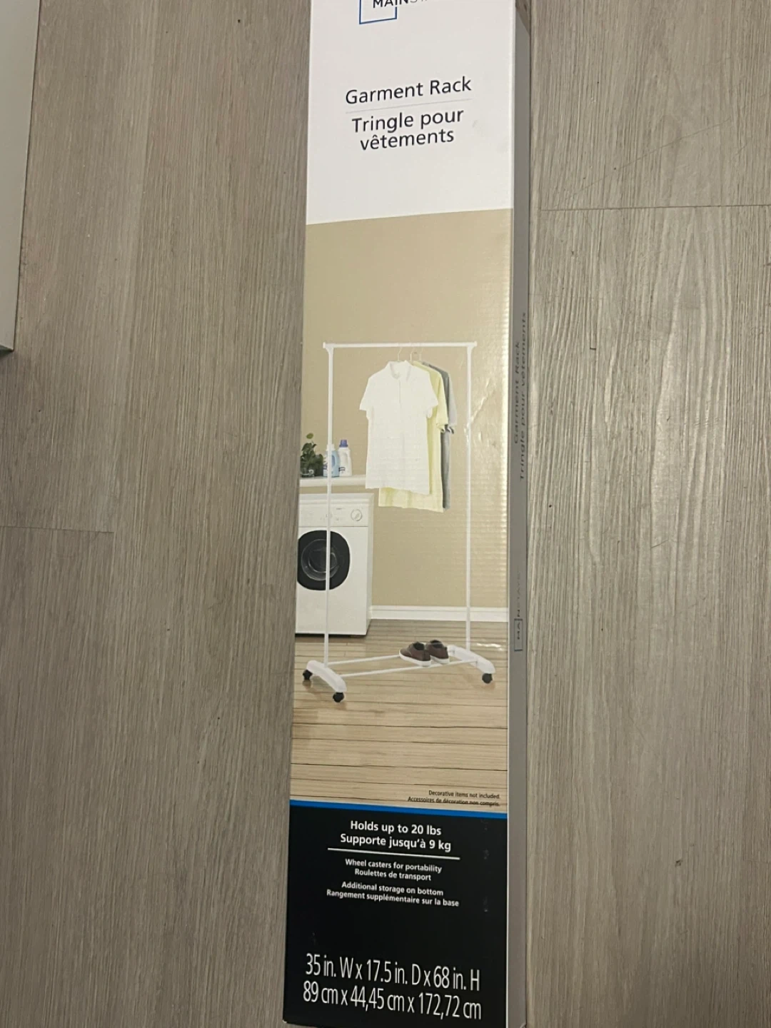 Selling a Mainstays garment rack. It holds up to 20 lbs and has wheel casters for portability. There is storage on the bottom for shoes. Dimensions are 35 in W x 17.5 in D x 68 in H.