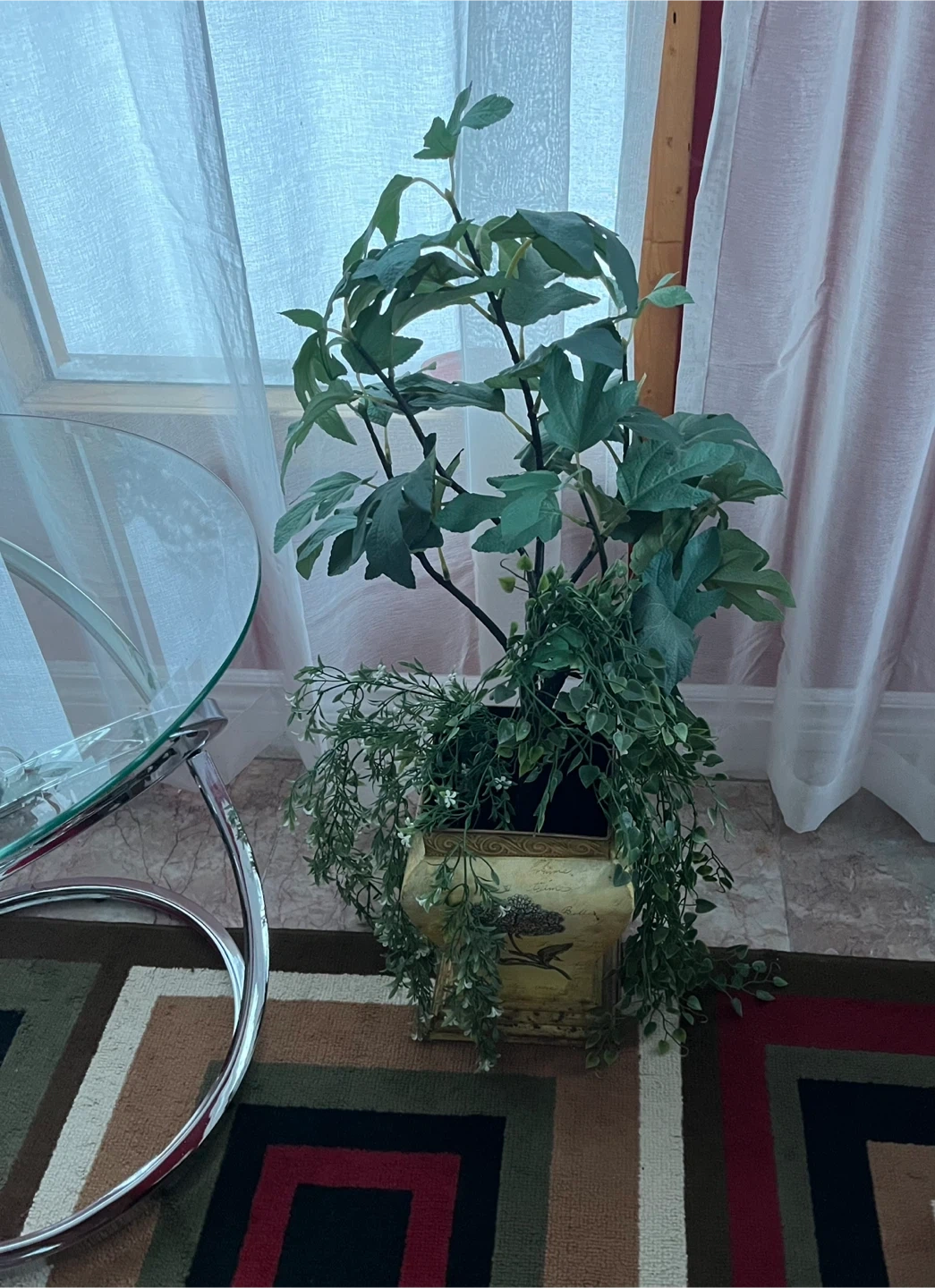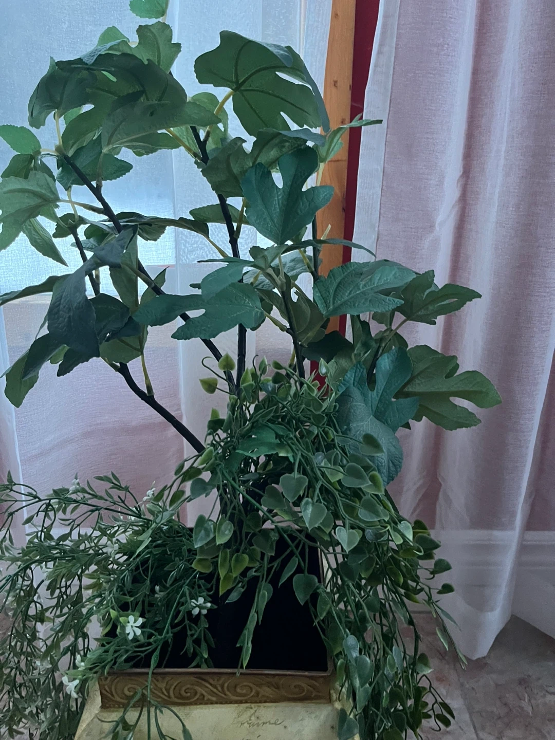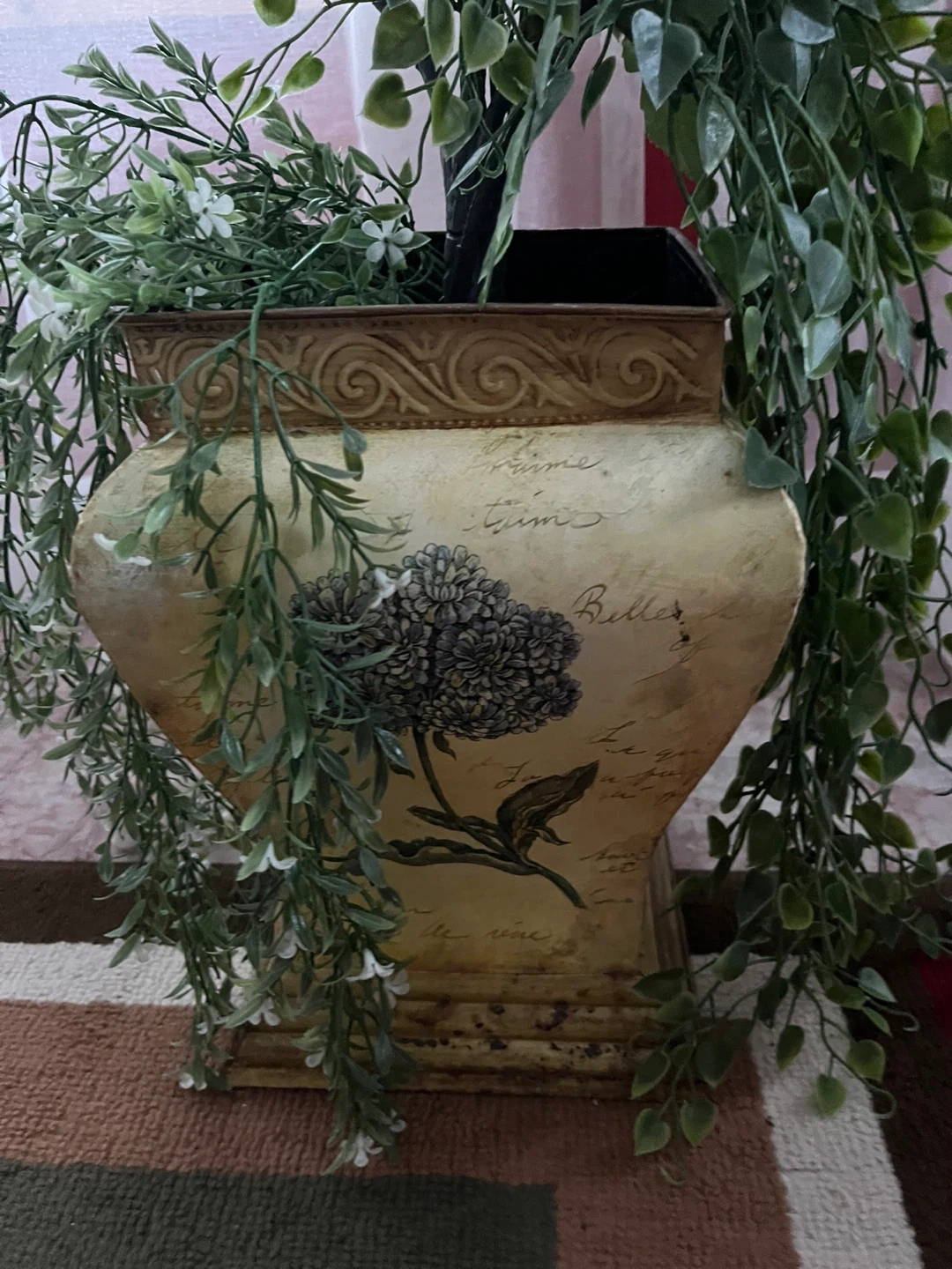 Selling a decorative fake floral planter that would look great in any home! It features a unique design with floral accents. Perfect for adding a touch of elegance to your living space