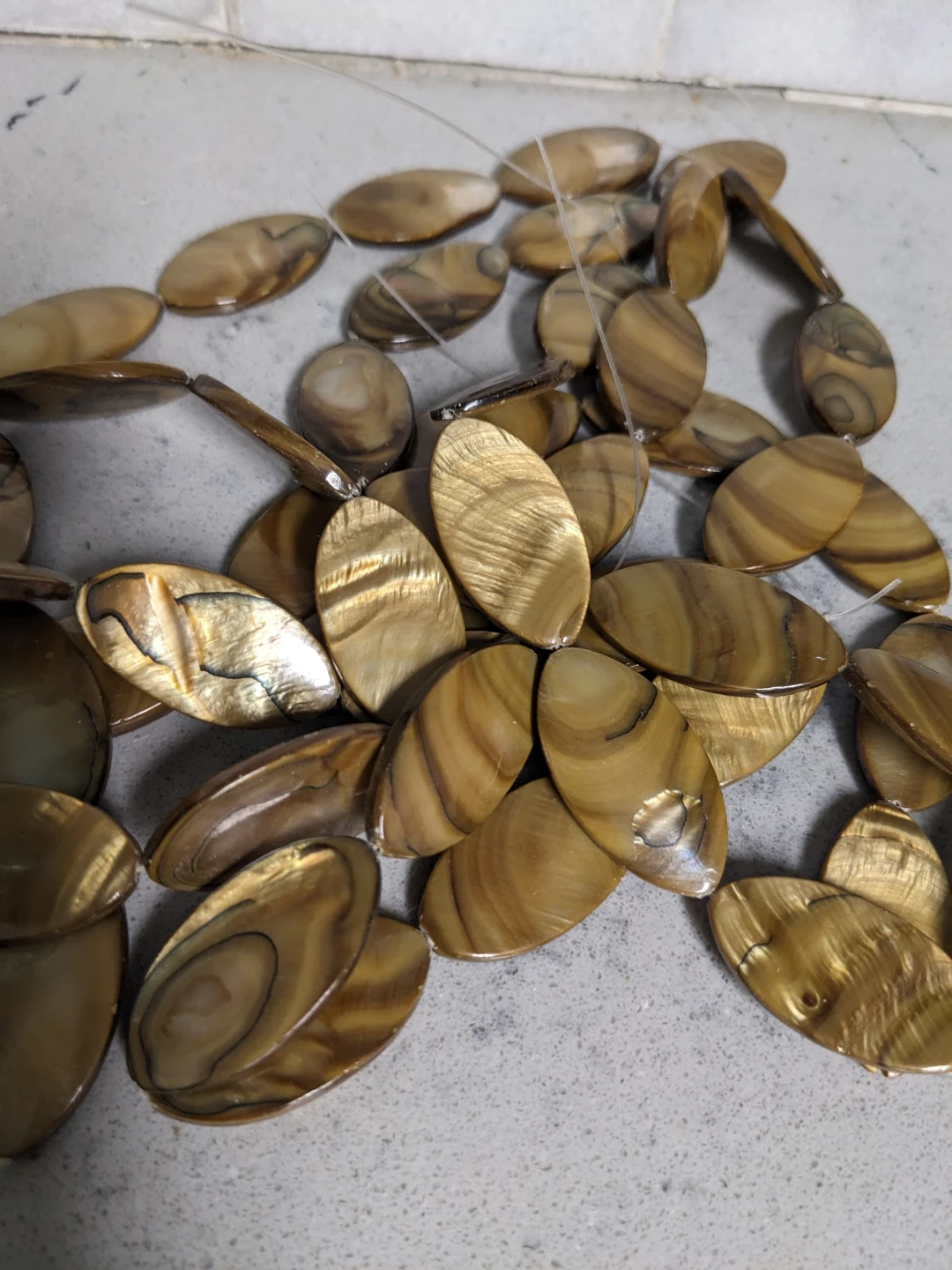 Flat oval mother of pearl shell beads 30x16mm gold brown