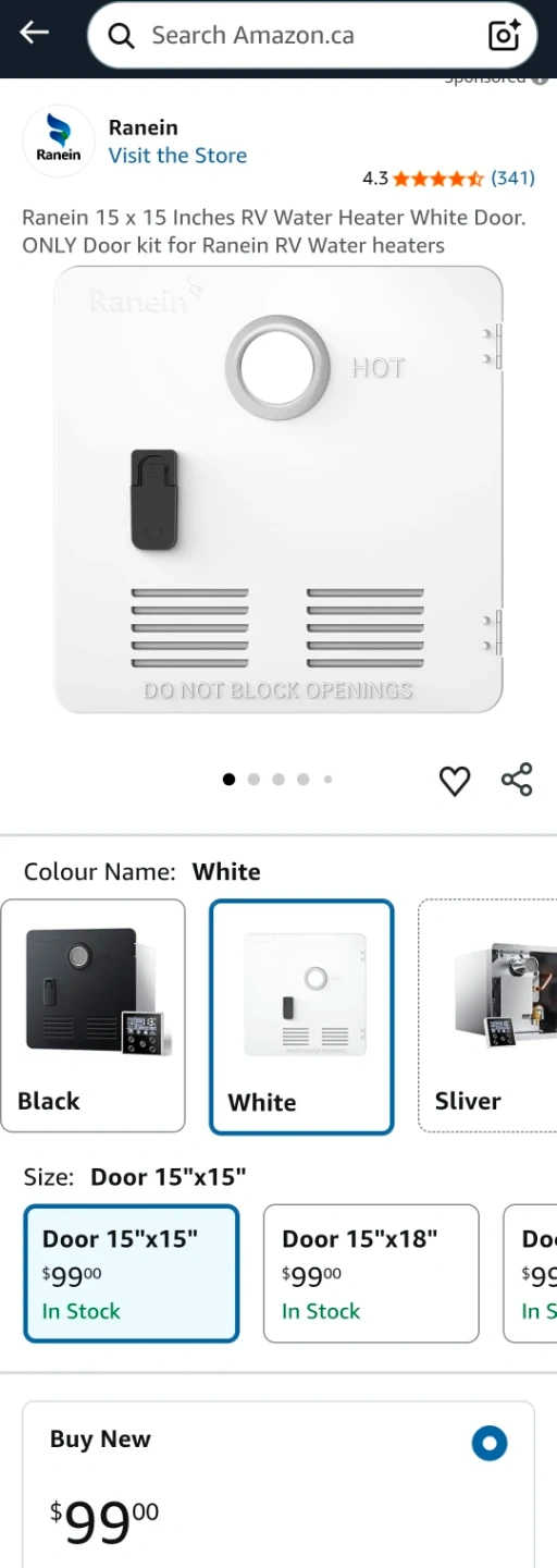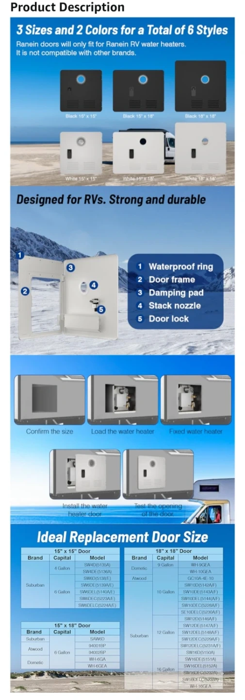 I'm offering a new Ranein 15 x 15 inches RV water heater door, designed to fit Ranein RV water heaters. This door kit includes everything you need for installation. Keep your RV's water heater protected and easily accessible with this durable and well-designed access door.