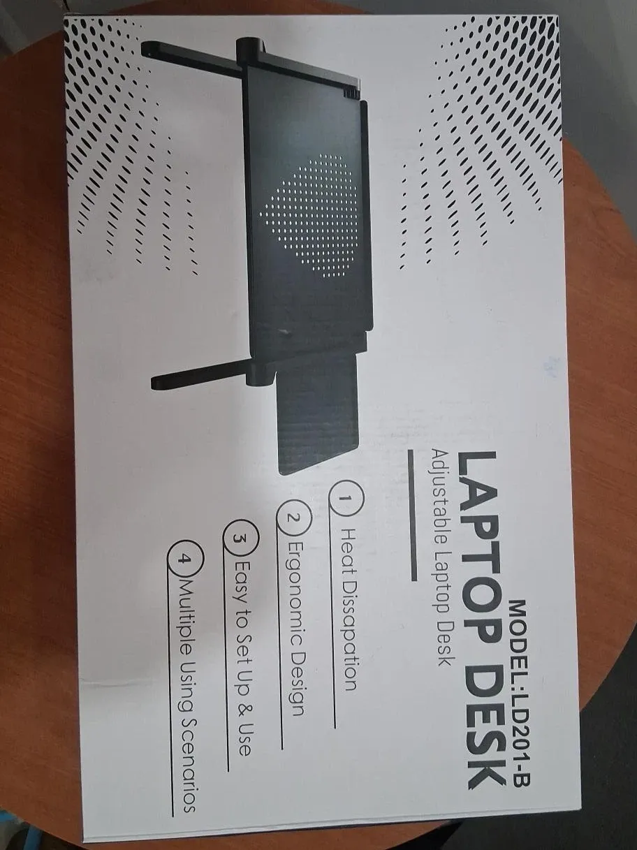 Selling an adjustable laptop desk, model LD201-B. It features heat dissipation, an ergonomic design, and is easy to set up and use. It also supports multiple using scenarios