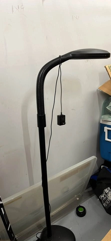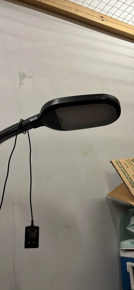 Black flexible desk lamp with adjustable neck and attached mirror. The lamp is in good condition with some signs of use. It has a flexible gooseneck and a small rectangular mirror. The lamp comes with a power adapter.