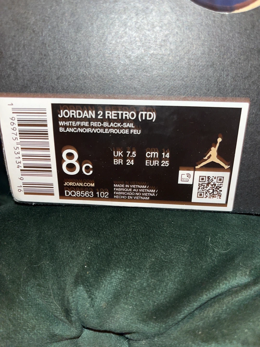 Selling a pair of Jordan 2 Retro (TD) sneakers in size 8C. They come with the original box. These shoes are in good condition and ready for a new home!