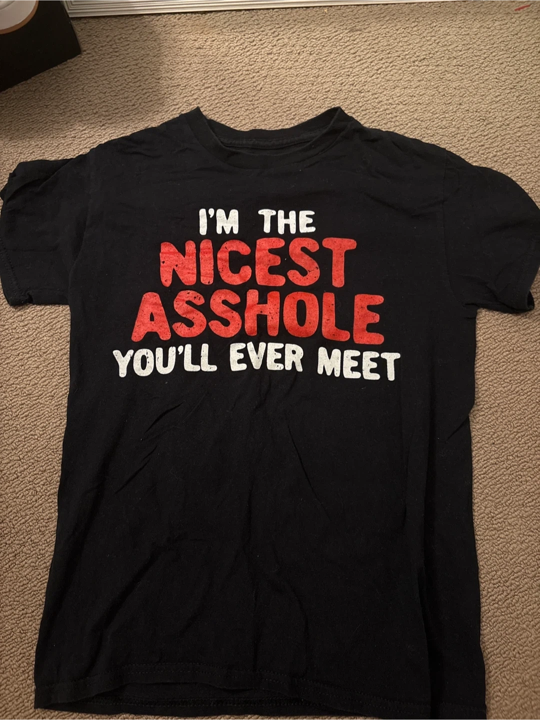 Selling a black t-shirt with the phrase 'I'm the Nicest A**hole You'll Ever Meet' printed on it. It's in good condition and ready for a new owner!