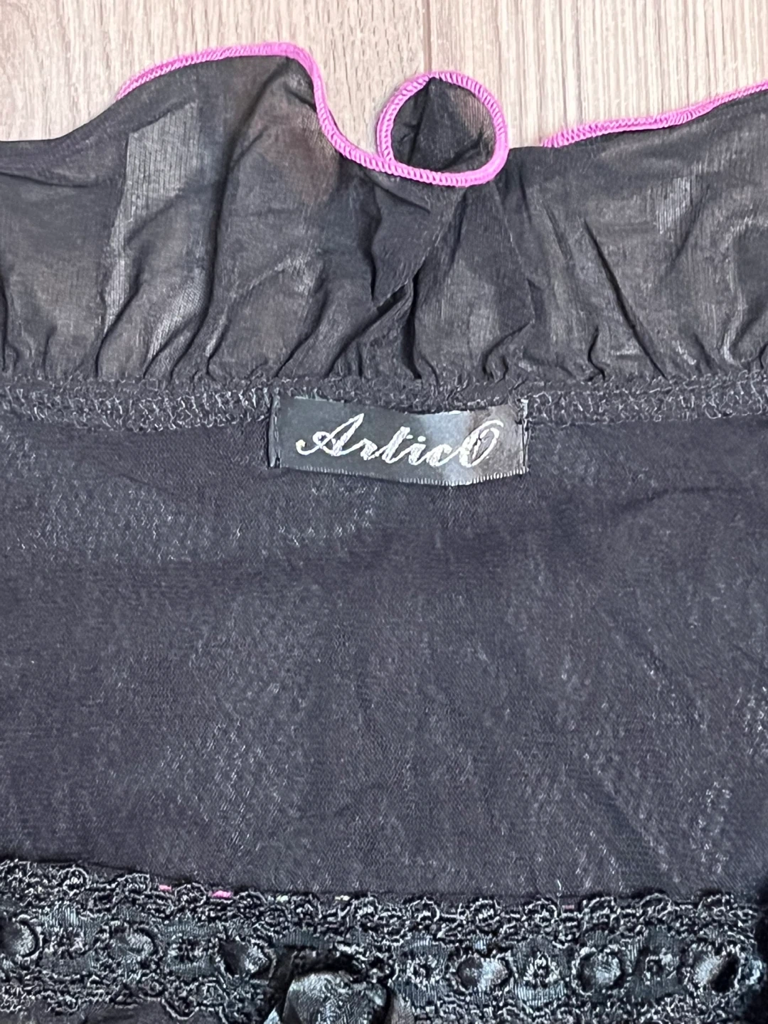 Here's a beautiful Artico blouse in a black floral pattern! It features long sleeves and ruffle detailing. This blouse is perfect for adding a touch of elegance to any outfit.