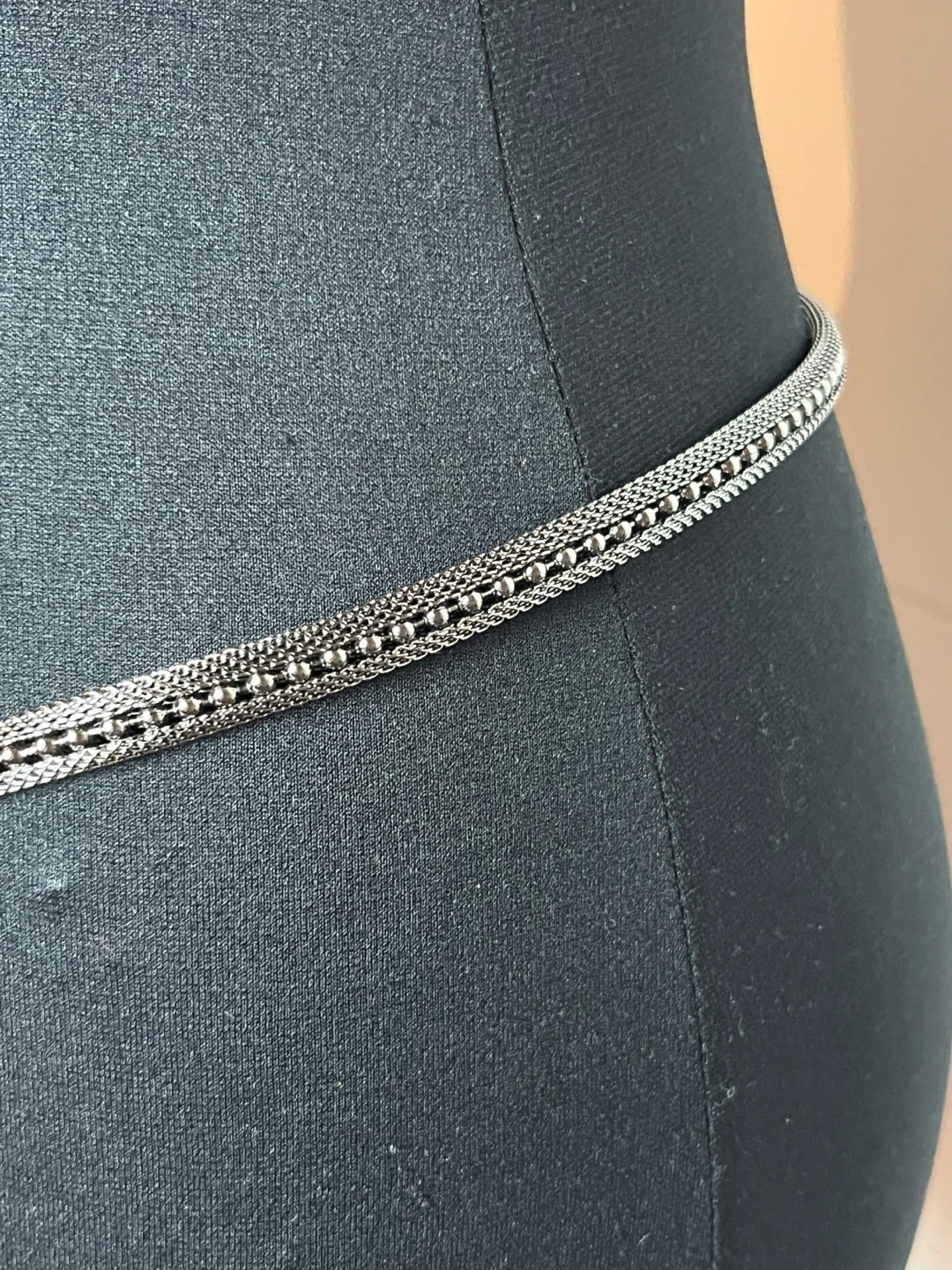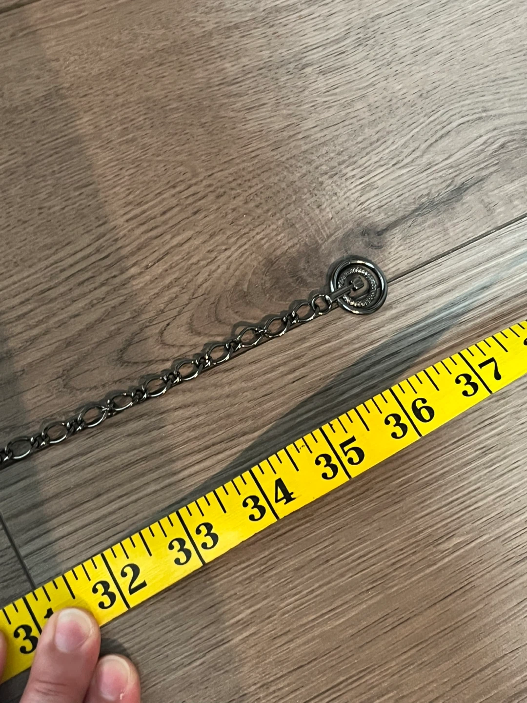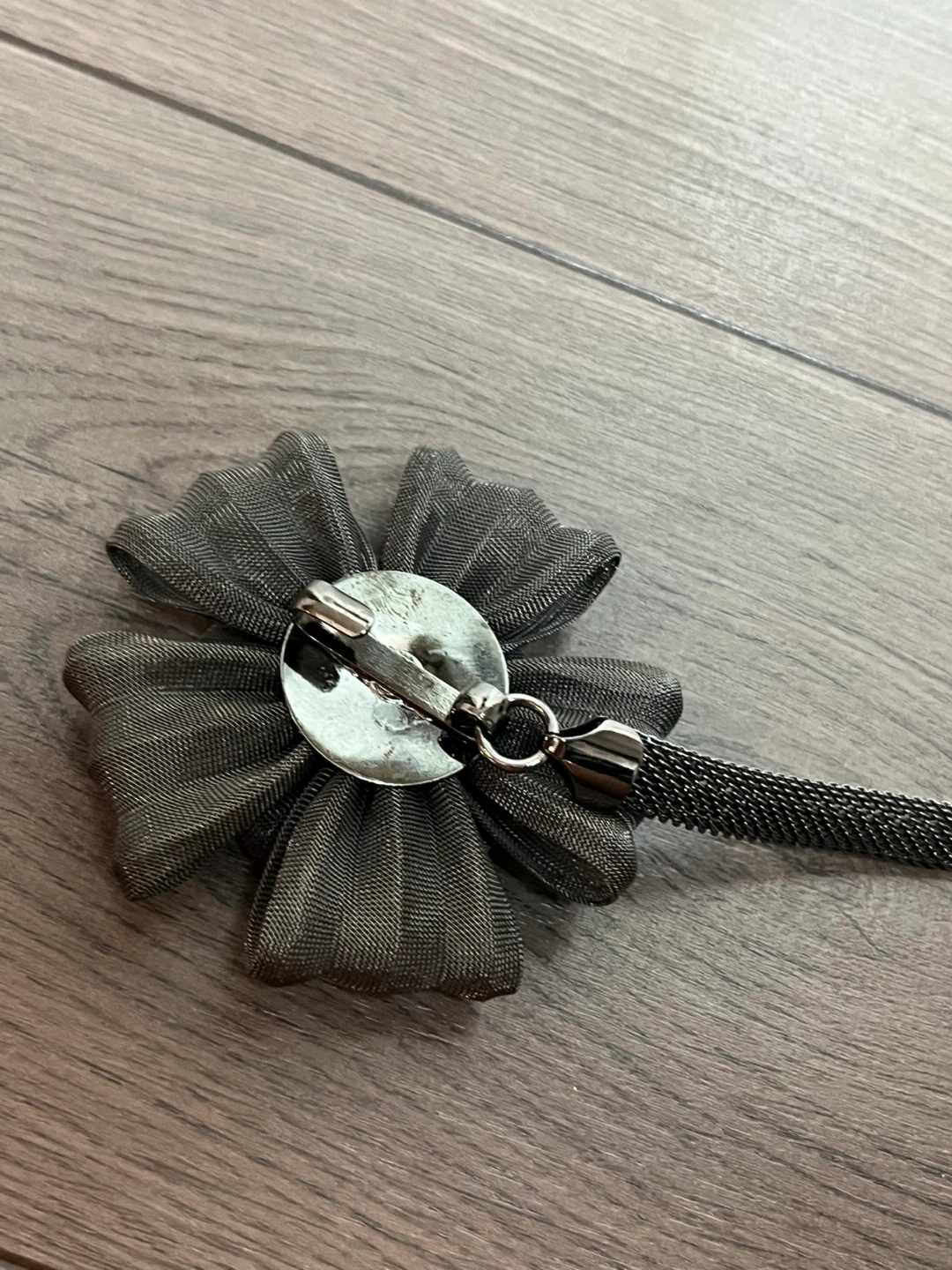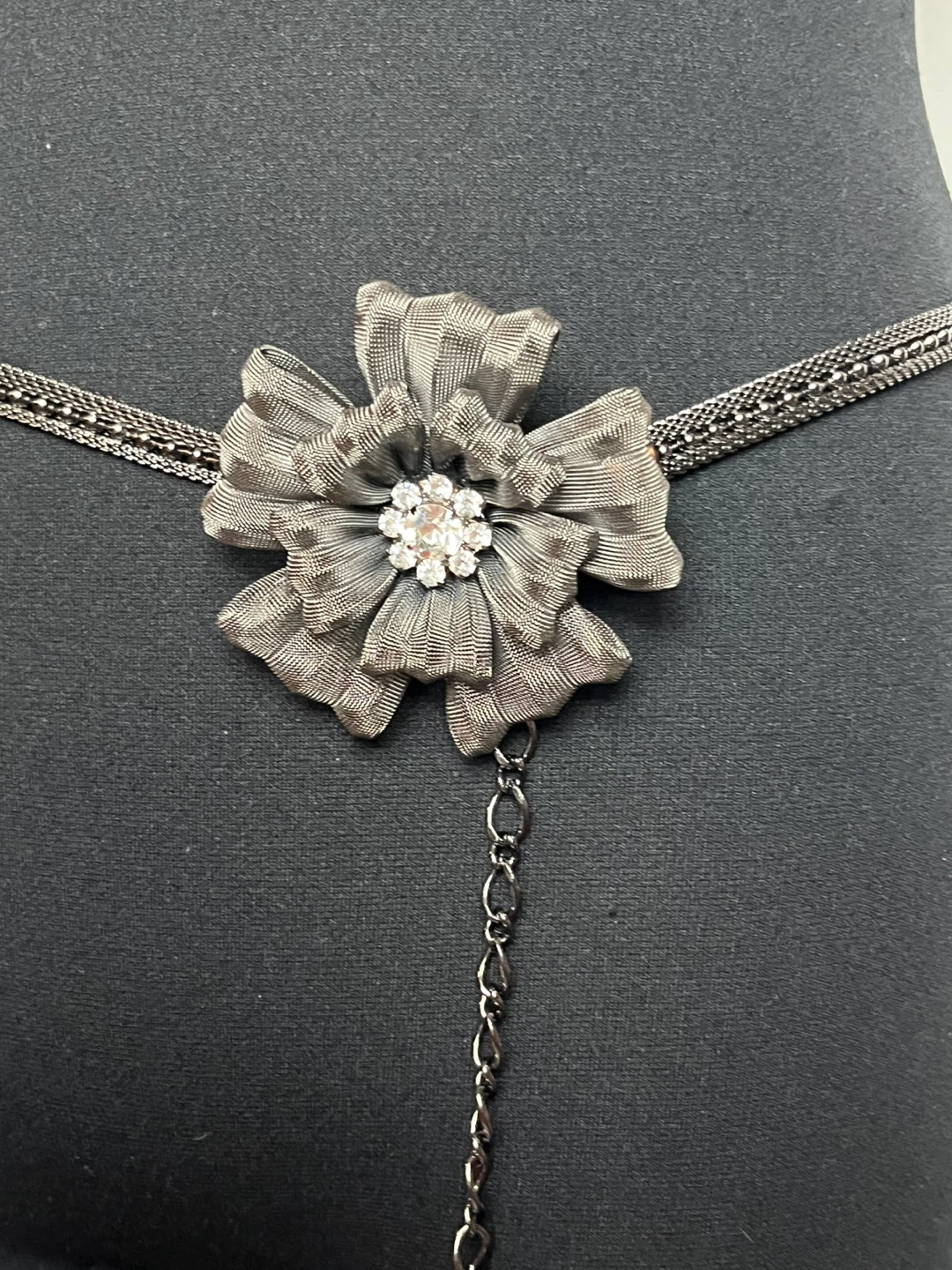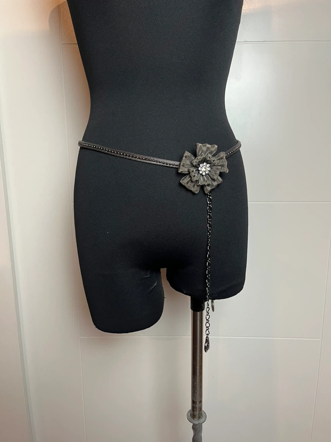 This is a really cute flower belt! It features a silver/grey flower with a chain. The chain is approximately 37 inches long. It’s in great condition and ready to add some flair to your outfit!