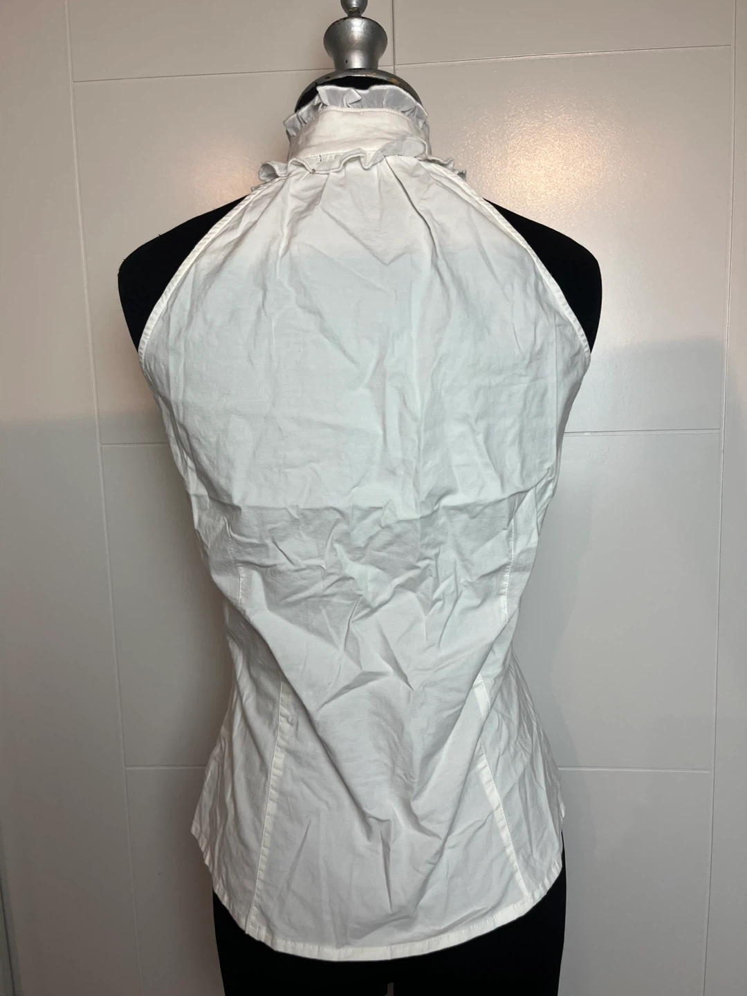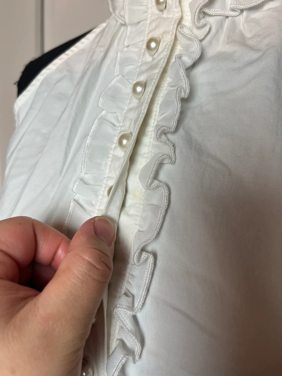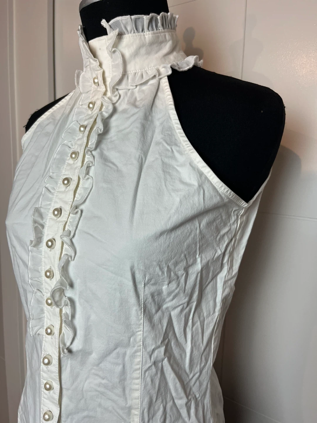 Here's a white sleeveless blouse with a ruffled high neck and pearl-like buttons. It's in good condition, though there's a small stain as shown in the pictures.