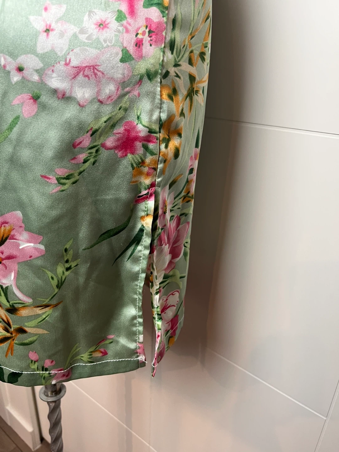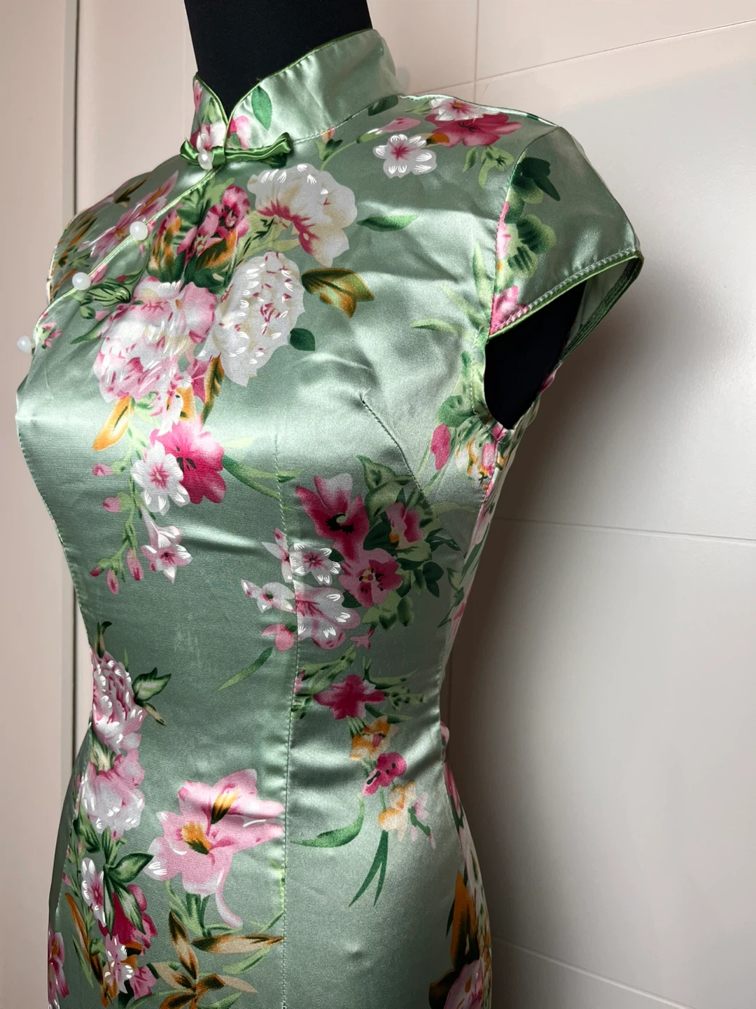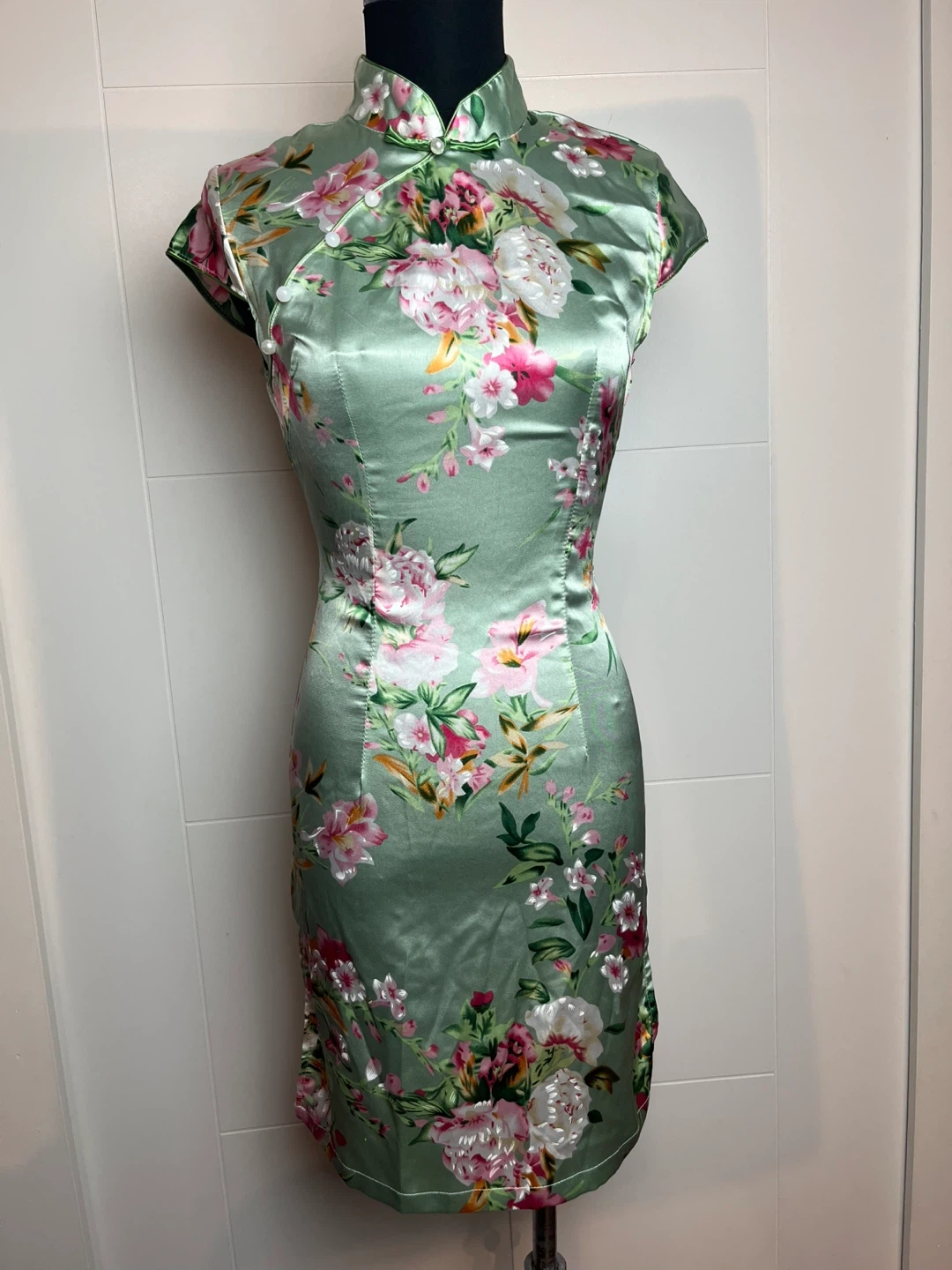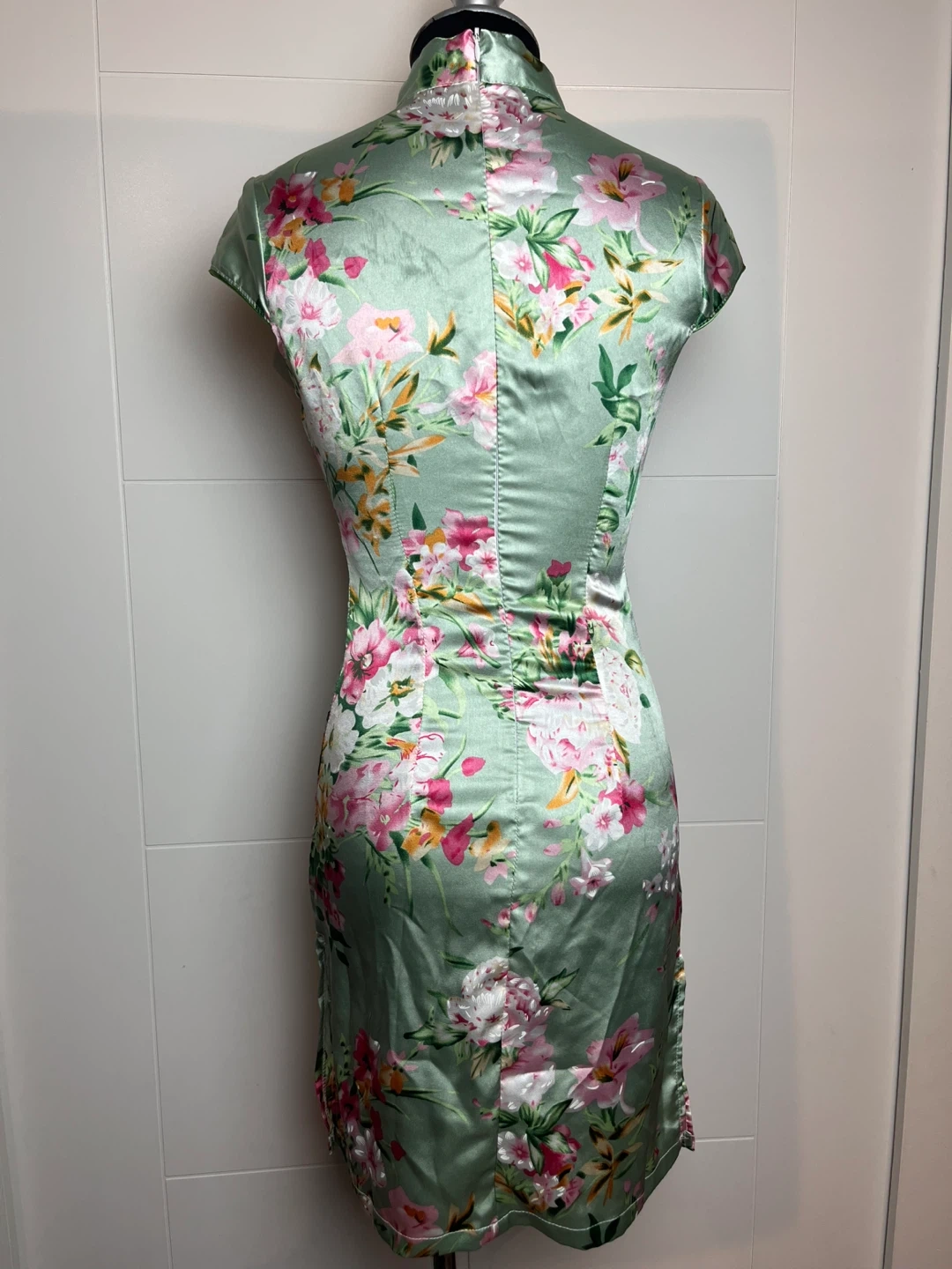 Beautiful floral cheongsam dress in a light green colour. It's in great condition and has a lovely sheen to the fabric. Perfect for a special occasion or just to add a touch of elegance to your wardrobe!
