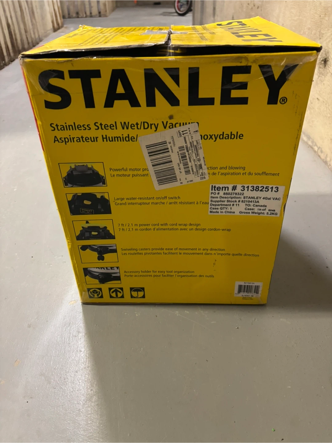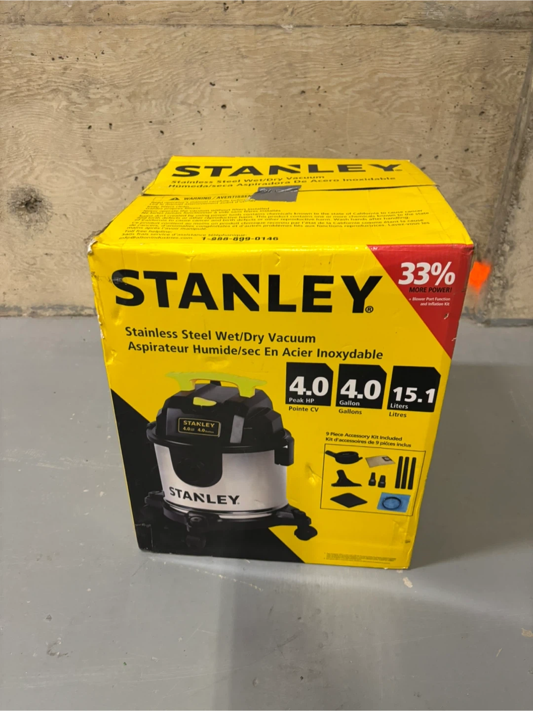 Selling a Stanley stainless steel wet/dry vacuum, 4 gallon capacity. The box includes a 9 piece accessory kit. It has a powerful motor for suction and blowing. The vacuum also features a large water-resistant on/off switch and swivelling casters for ease of movement. Also has a 7 ft / 2.1 m power cord with cord wrap design and an accessory holder for easy tool organization
