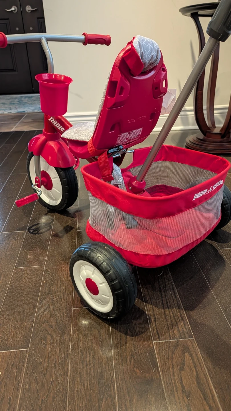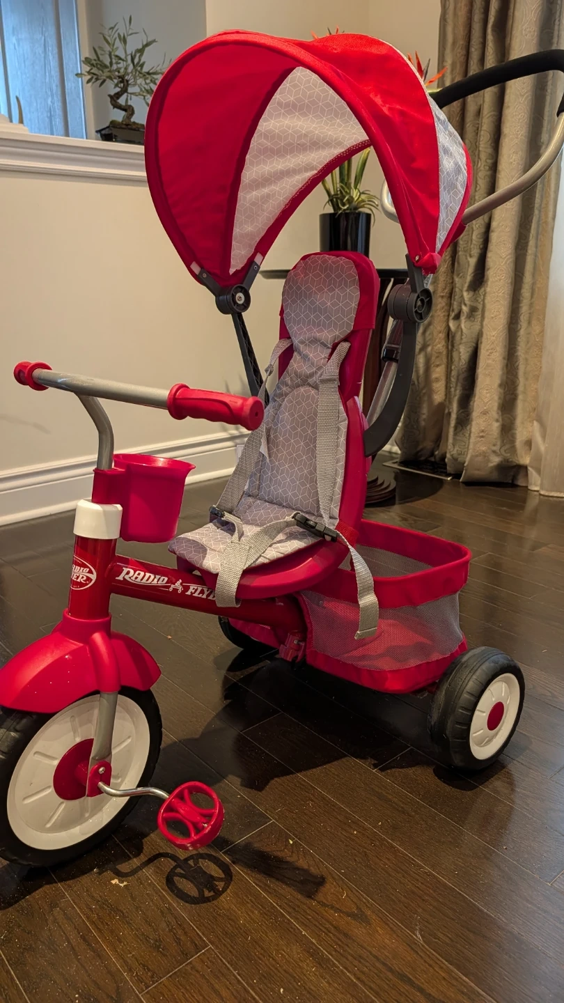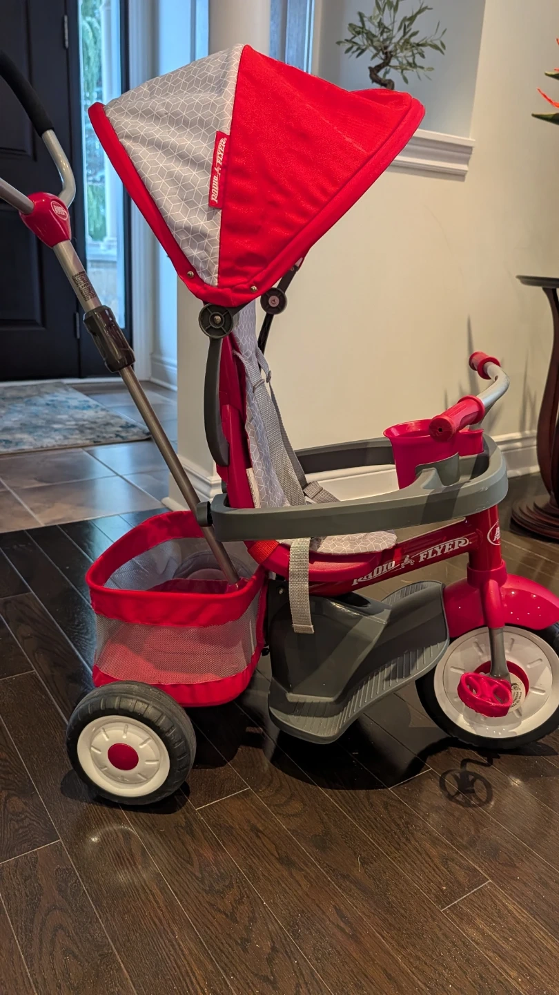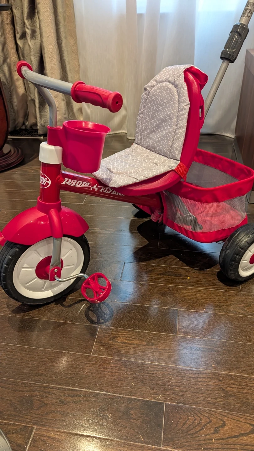 Selling a Radio Flyer Steer & Stroll Trike in red! It's in great condition and ready for a new little rider. This trike is perfect for toddlers learning to ride. It features a sturdy frame, comfortable seat, and parent steering handle. The trike also has a storage basket for toys and essentials