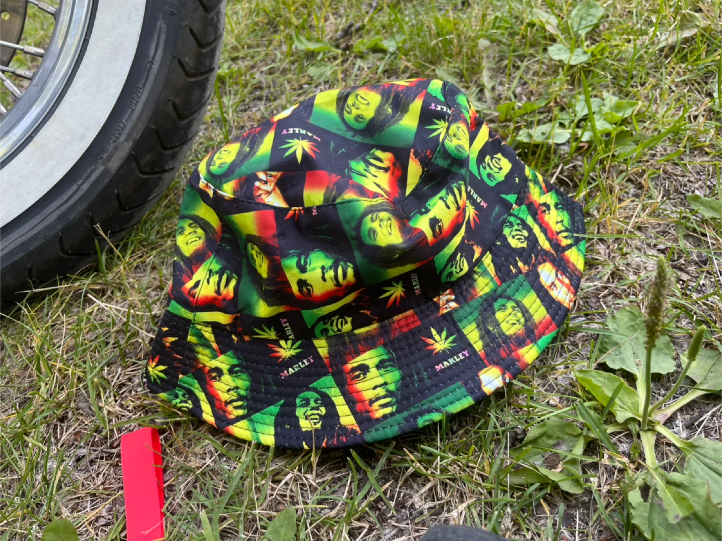 This bucket hat features a vibrant Bob Marley print in rasta colours. It's a fun and unique accessory to add to your wardrobe.