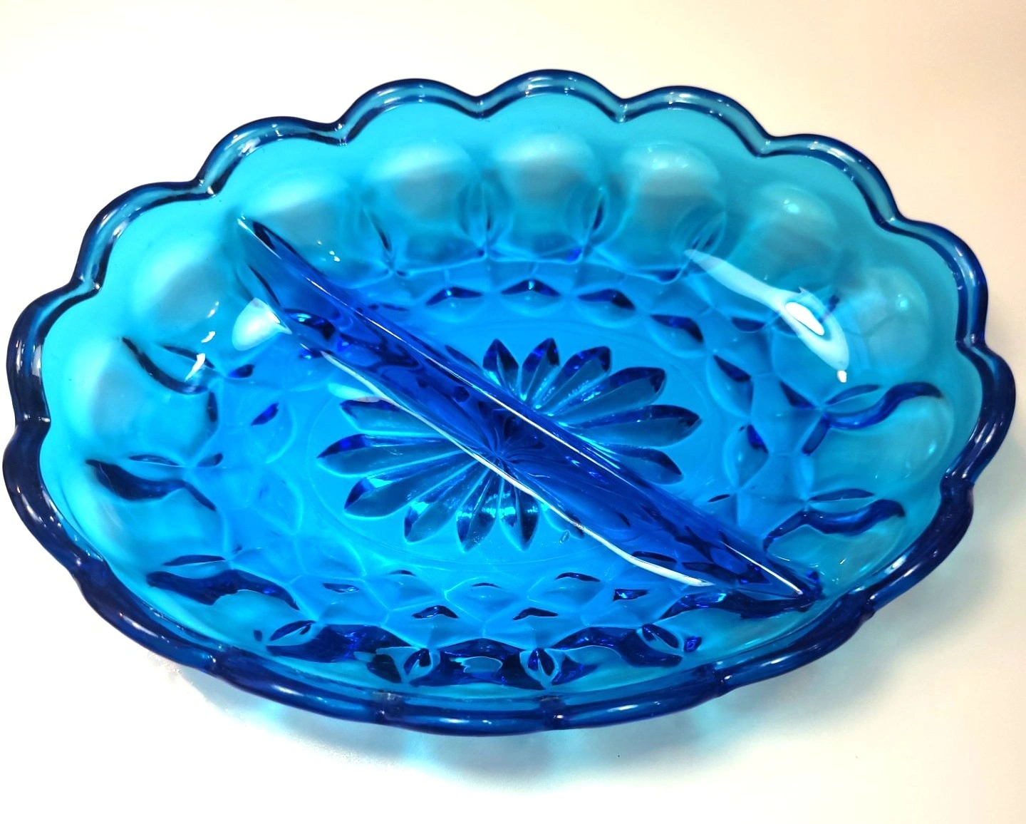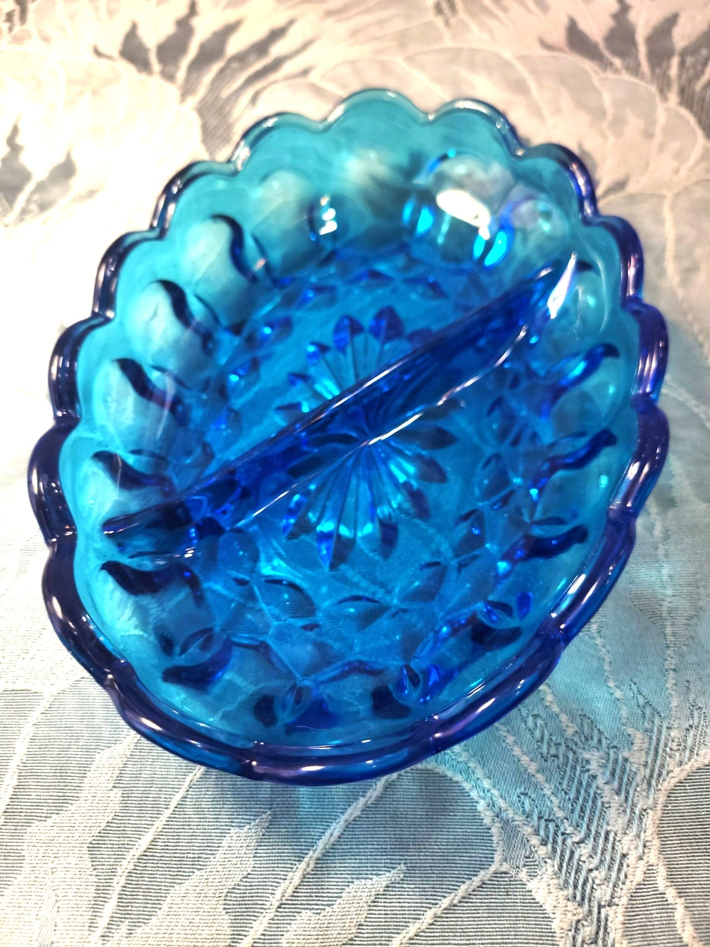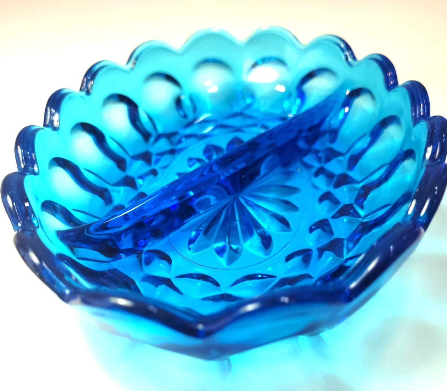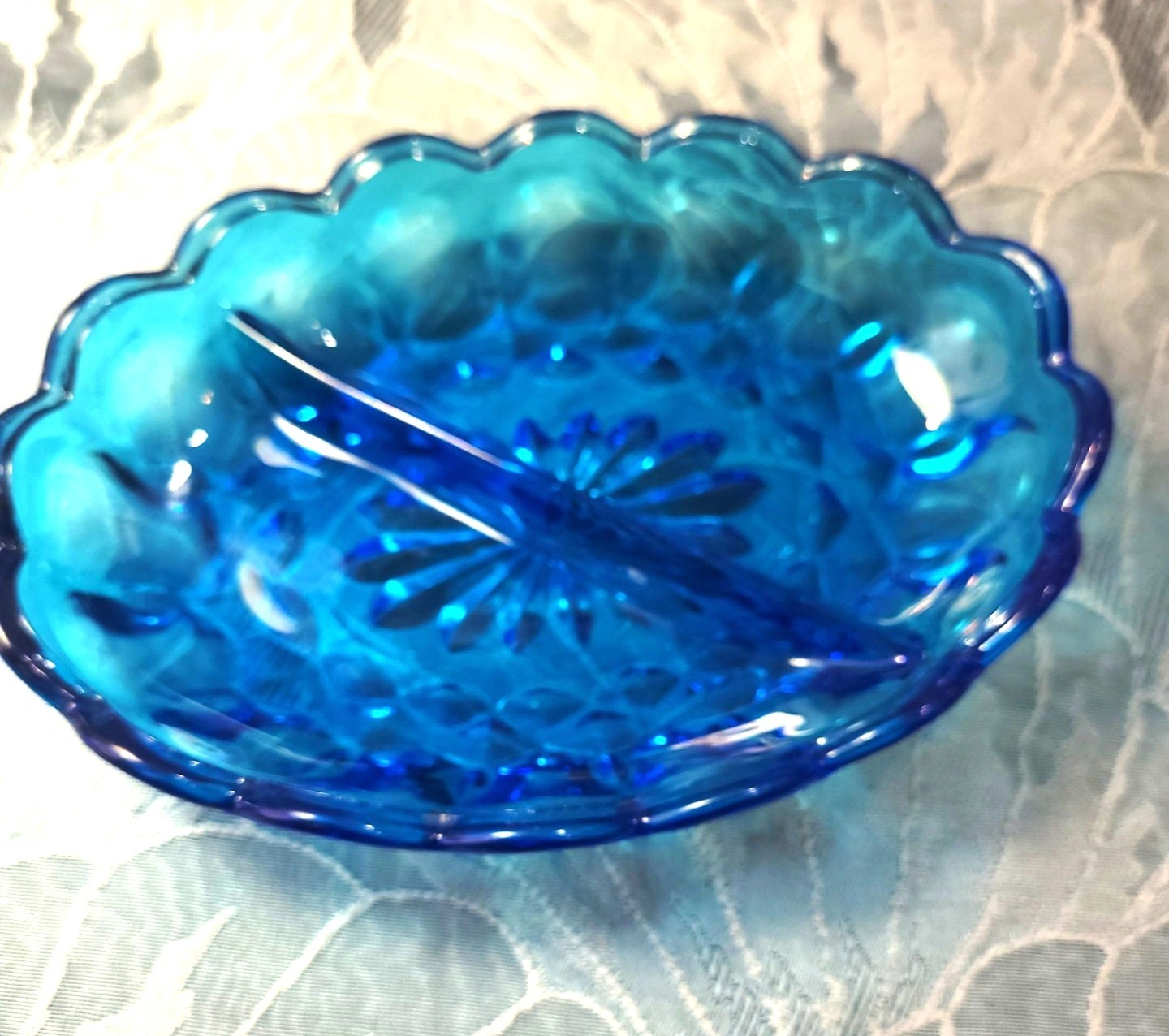 Beautiful vintage pressed glass divided relish dish in a vibrant translucent blue.