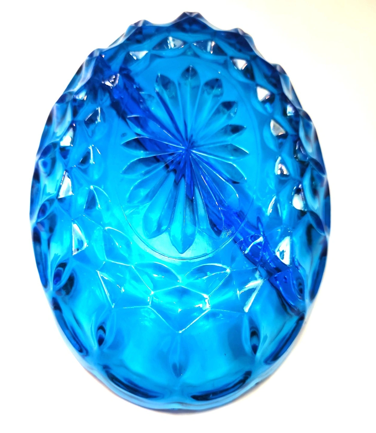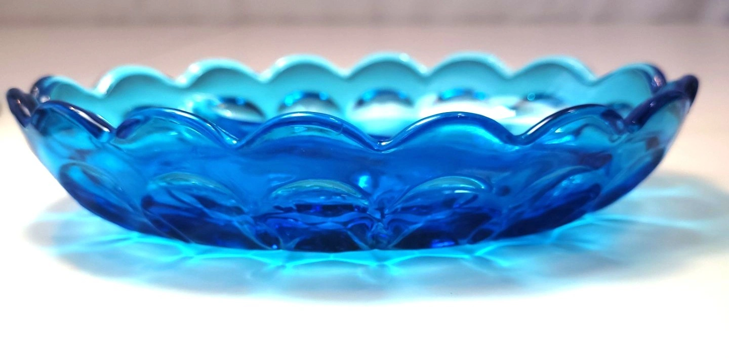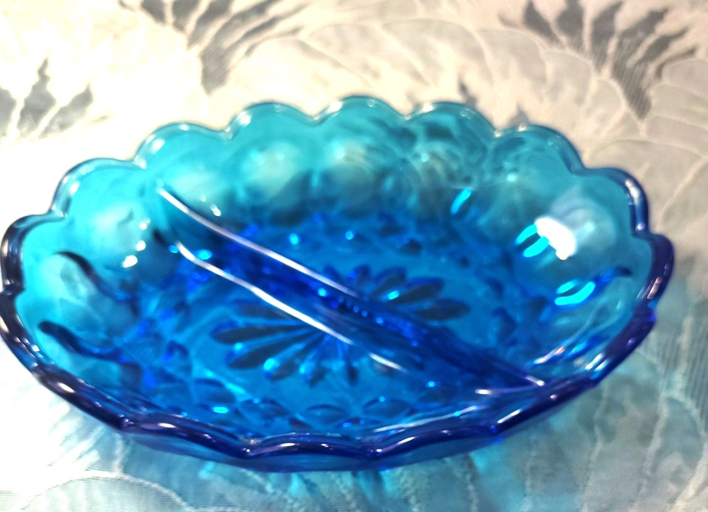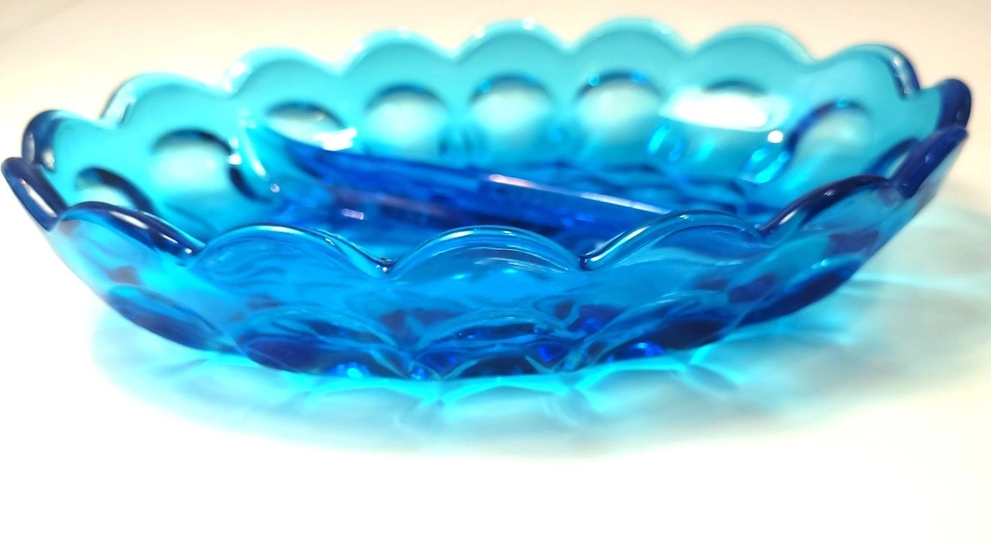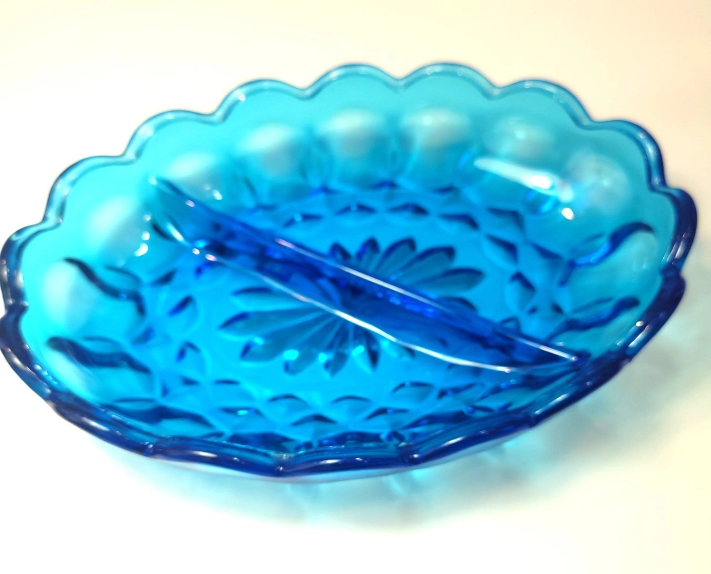 Beautiful vintage pressed glass divided relish dish in a vibrant translucent blue.
