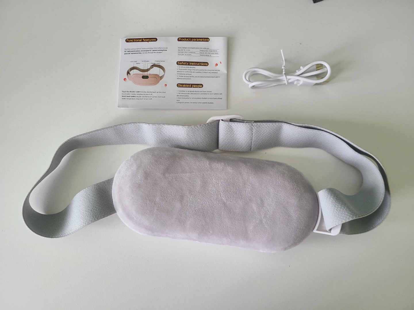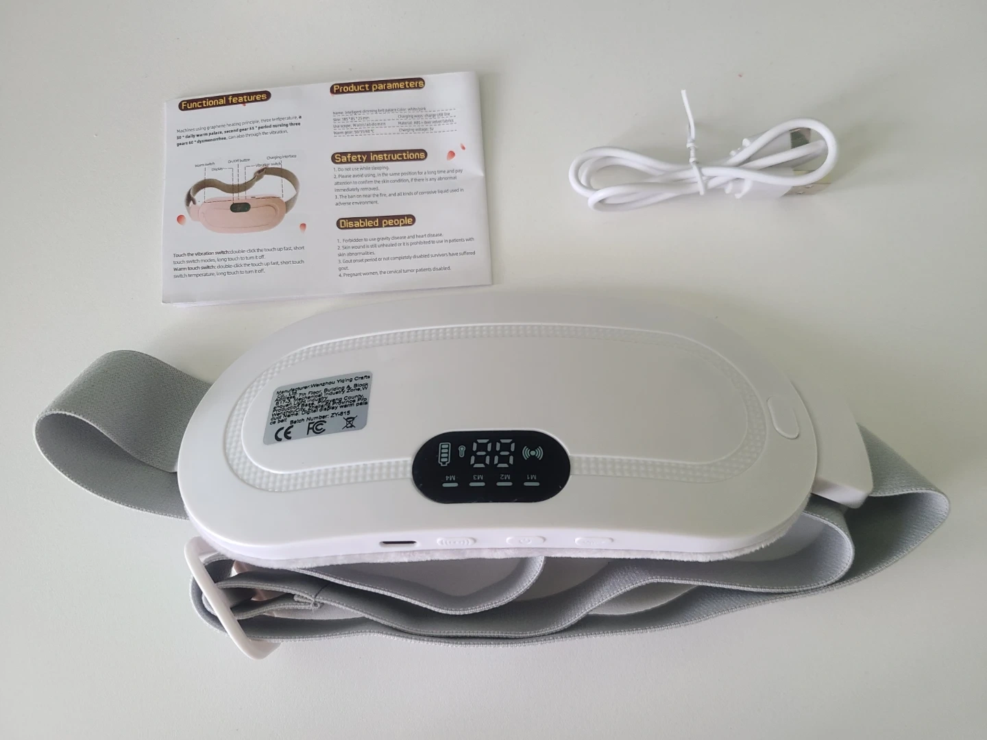 Selling a vibrating heating pad with a strap! It comes with a USB charger and instructions. It has functional features and product parameters, as well as safety instructions. Temperatures can be adjusted between 50°C to 60°C. Measures about 185 × 85 × 25 mm.