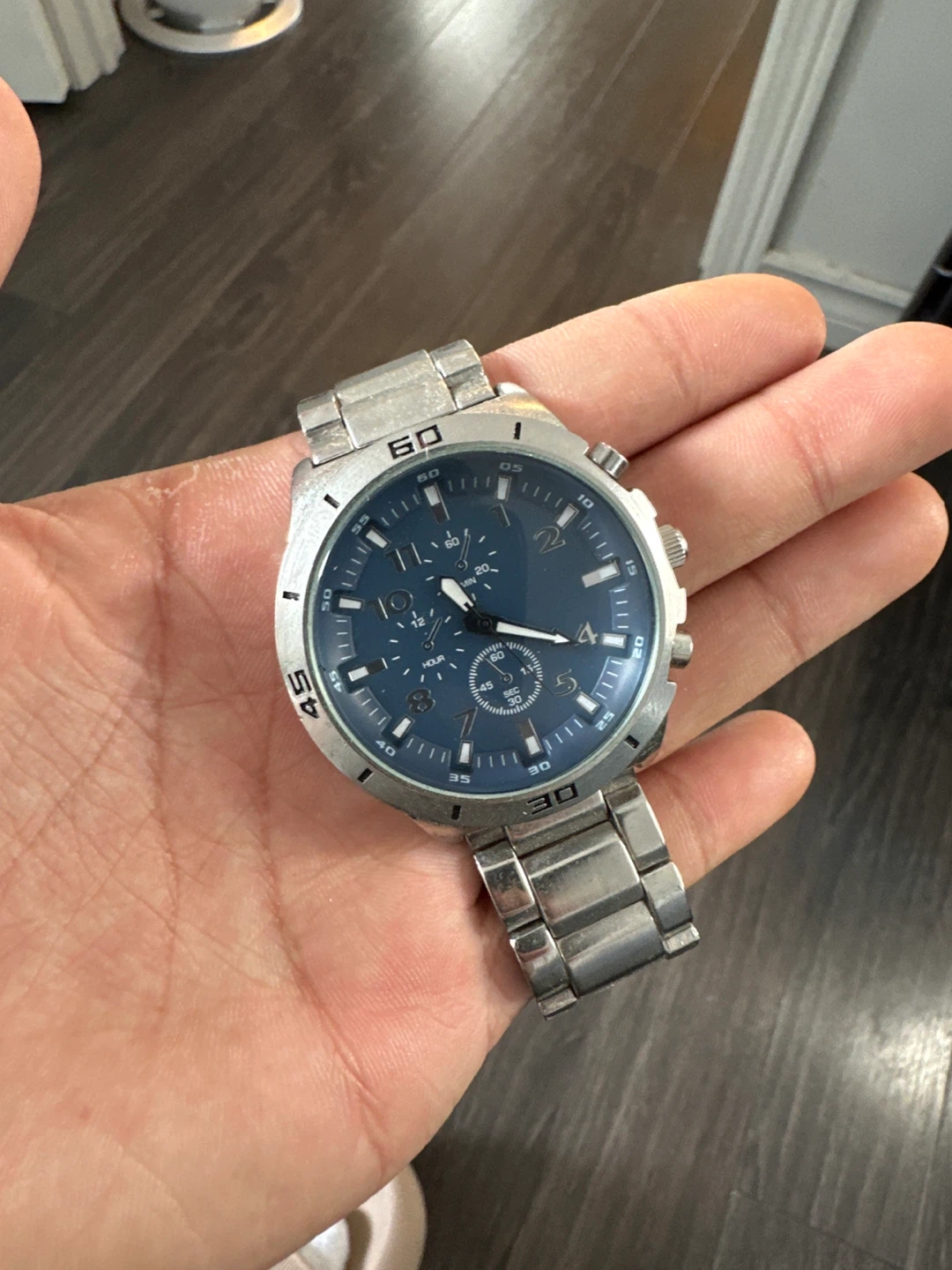 Selling a wristwatch with a silver-tone band and a striking blue face. It's in good condition and ready for a new wrist! The watch features clear markings and a classic design.